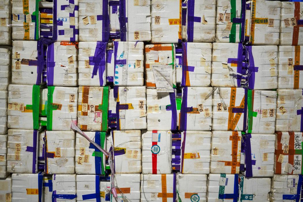 These images were taken in Cheung Sha Wan (Hong Kong) wholesale food market, a major port for food import, where polystyrene boxes are mostly used.