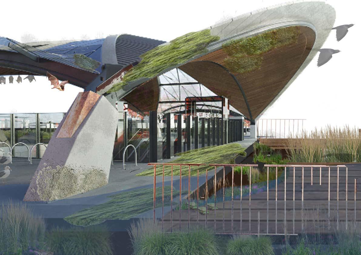 Proposed metro station: Increases noise, decreases site lines to water, pollution increase connects the site to its greater context, brings users in and creates opportunity for connection on arrival (+) (-)