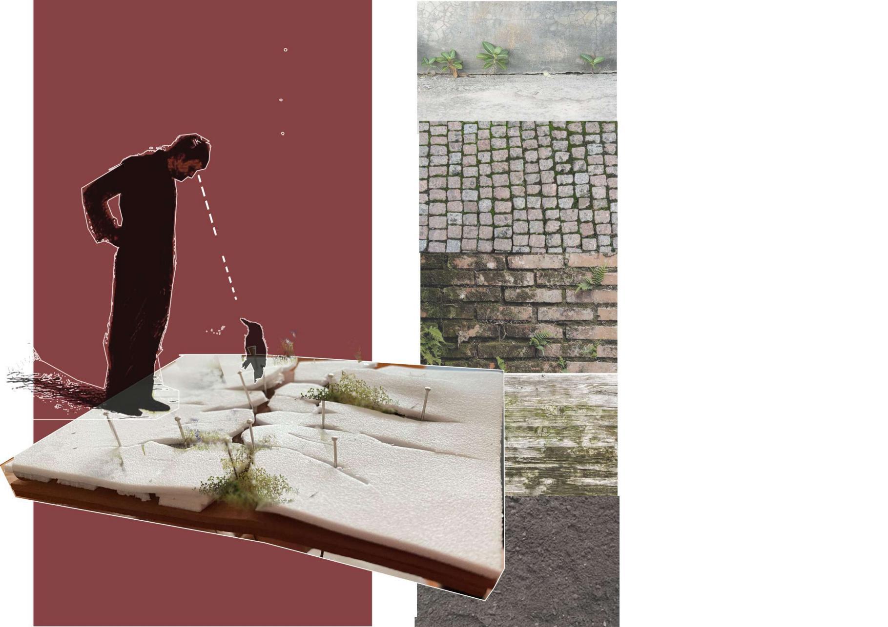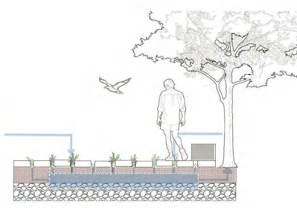 Natrual gaps between materials allow small creature hidden and collect water for irrigation to prevent extreme weather.