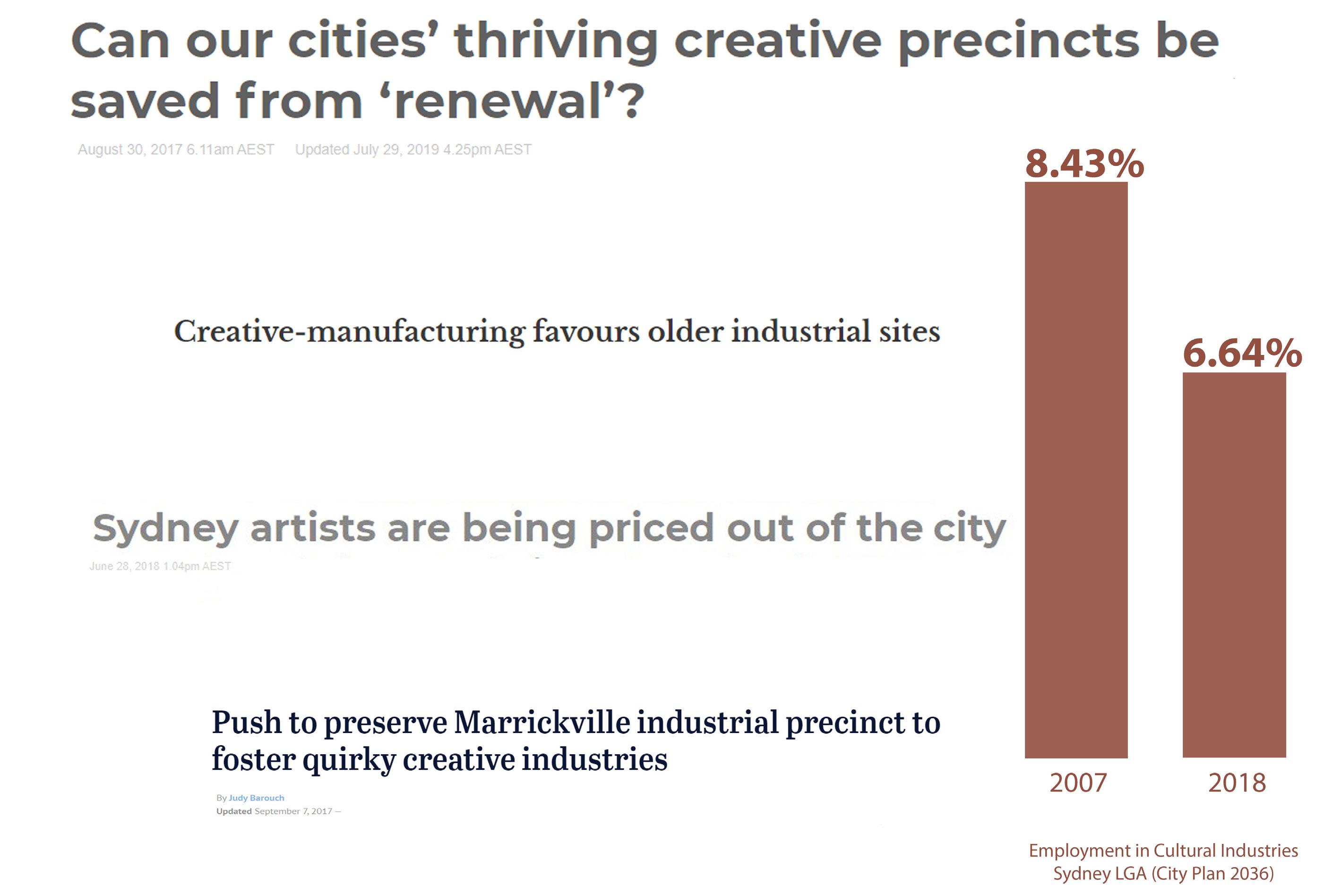 Over a 10-year period, the FES Floor Space and Employment Survey found an overall reduction in the supply of space used for creative industries within the City area, a decline of more than 100,000m2 (City of Sydney, 2017).