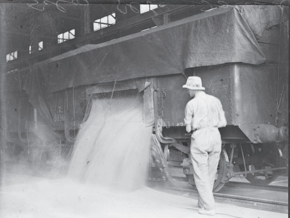 Man overseeing grain being poured from a train carriage at Glebe Island silos, Sydney ca. 1920. Sourced from National Library of Australia