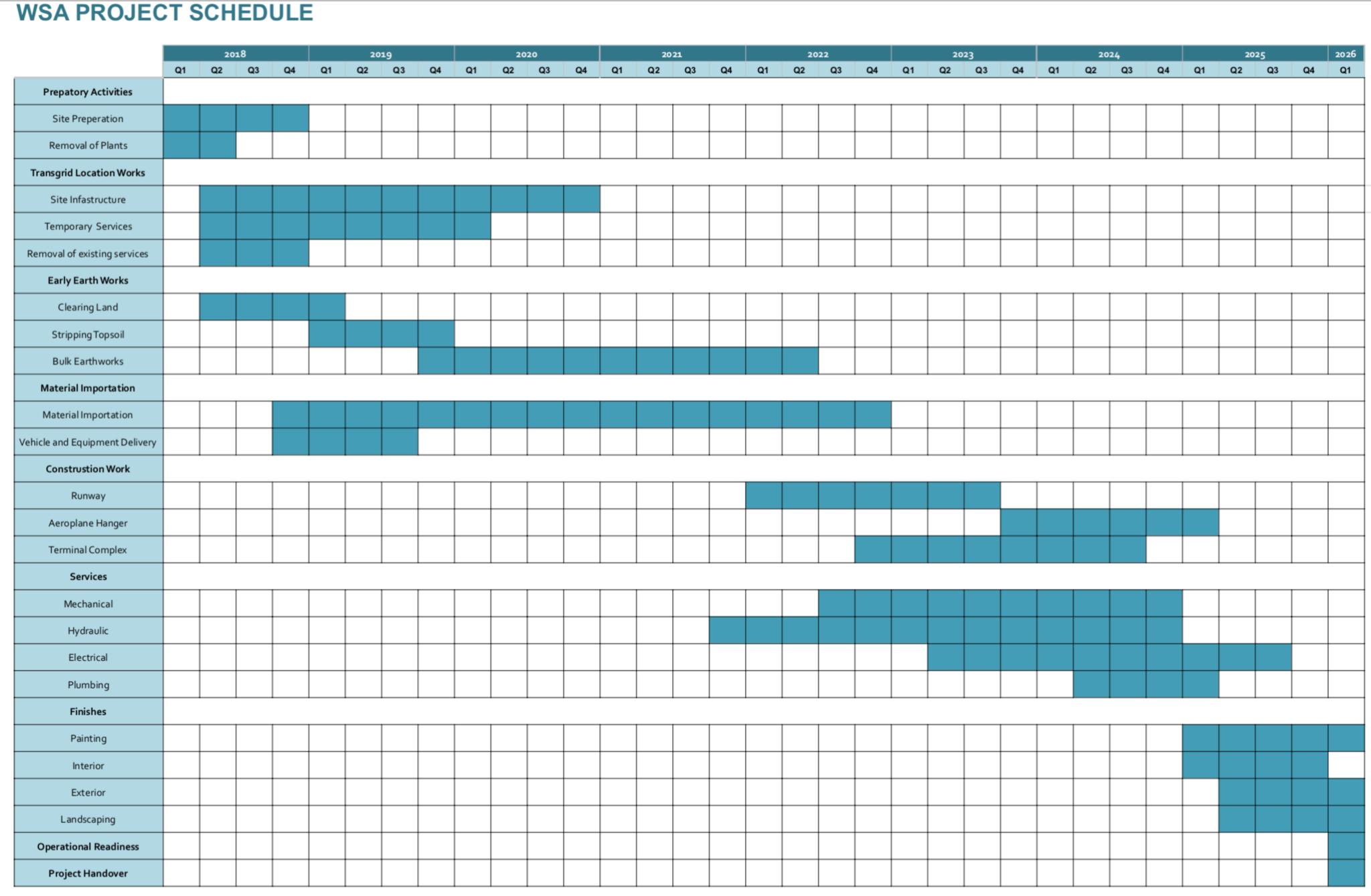 As with most facetsofconstruction,successinexecutionisbasedonthedepthofpreparation Insuch a light the Western Sydney (Nancy-Bird Walton) International Airport benefits from preparation and planning at a very earlystageinitslifecycle Furthermore,consideringthenatureofthisdevelopment as ongoing, it applies that this document is to be treated as a live document with frequent amendments Though preparation at an early stage minimizes therequirementforadditionalresource usage and time as the development process progresses it is important to understand the dynamics of construction and its position as a process thatisinconstantflux Therefore,conductingregularcheck ups and reviews of what is being doneisanimportanttoolinfacilitatingaddedflexibilitytoalargely linearprocess.