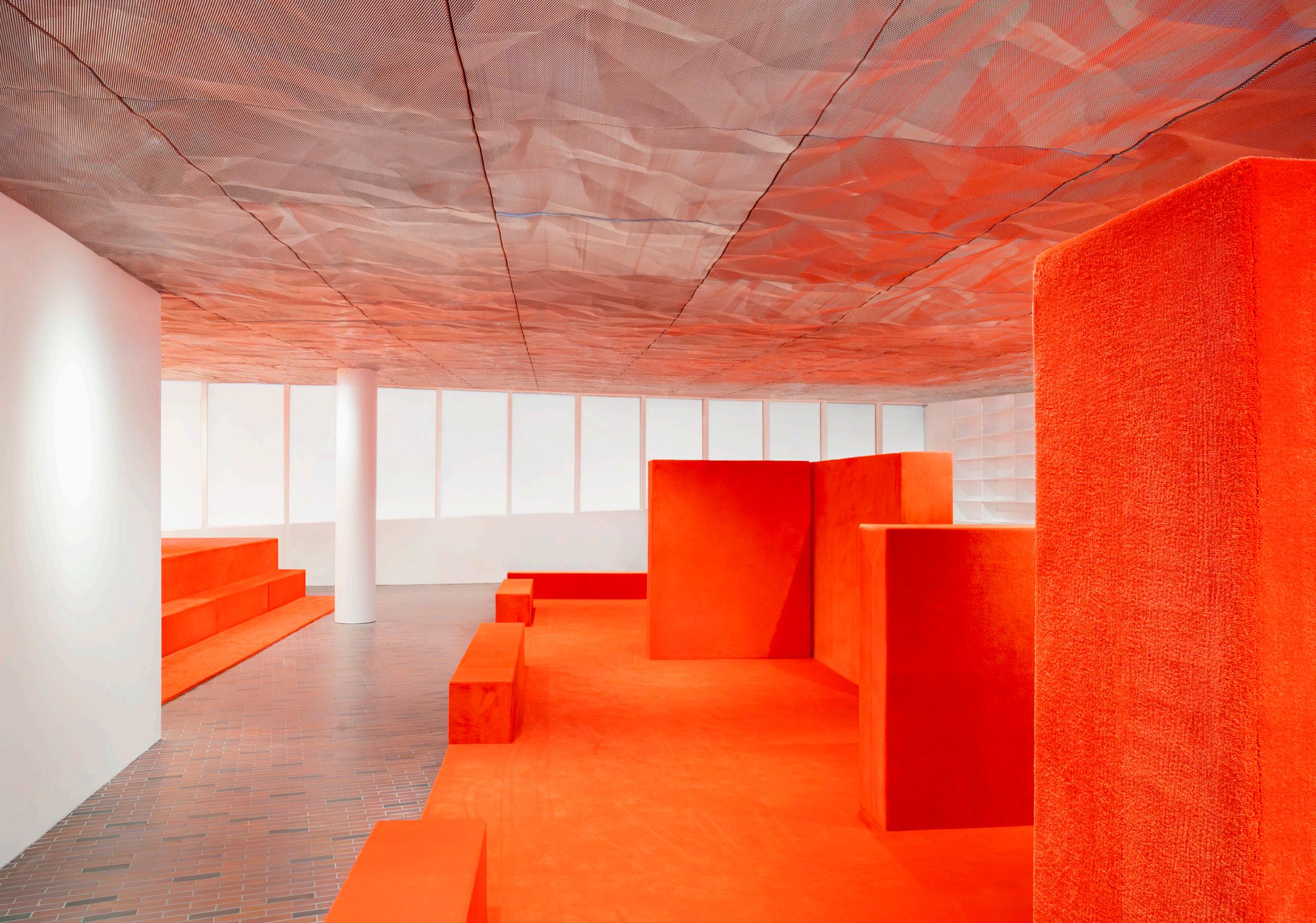 above Before installation, the vibrant orange of the shop displays and its reflection on the ceiling already created an impressive interior.