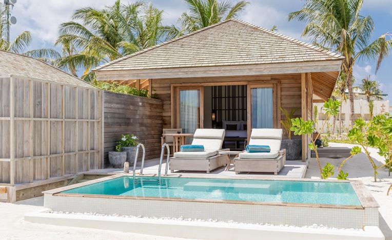 Dispone di 50 spettacolari ville private situate sia sull’acqua che sulla spiaggia di sabbia bianca dell’isola. Ciascuna of fre una piscina privata a sfioro con vista panoramica sull’Oceano Indiano. Tutte le ville sono dotate dei migliori comfort e garantiscono la massima privacy agli ospiti. Per completare l’esperienza, Kagi Maldives Spa Island garantisce un au tentico viaggio culinario in ognuno dei suoi cinque ristoranti e bar che offrono il meglio della cucina asiatica, medi terranea e internazionale. Tra questi, il ristorante Ke - Un, specializzato in cuci na asiatica, latina e oceanica, e Nonna, un autentico ristorante italiano à la carte. Da notare che l’isola accoglie solo ospiti di età superiore ai 12 anni, garantendo tranquillità anche grazie all’attenzione al benessere di corpo e anima.