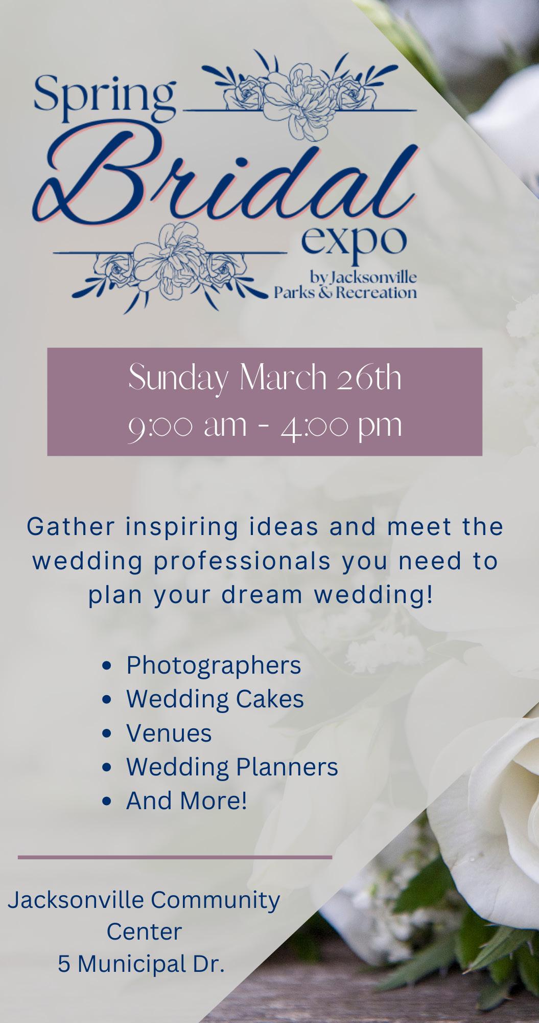 Get engaged this Valentine's Day?? Start your planning off right at Jacksonville’s first Bridal Expo, March 26 from 9 a.m.-4 p.m. for just $2! Jacksonville Parks & Rec, 5 Municipal Drive, Jacksonville.
