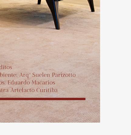 Graduada em arquitetura e urbanismo, Suelen nunca teve dúvidas so bre a profissão. Atuando nos segmentos de arquitetura e interiores resi dencial e comercial há 10 anos, seus projetos estão no Paraná, em São Paulo e também Miami, nos EUA. Para sua quinta participação na Mostra Artefacto, ela criou um espaço de 90 metros quadrados com jantar, living e adega integrados. “Assinamos um projeto onde mescla a natureza da madeira com um irresistível acento urbano, marcado pe los tons claros e off-white, criando sensações de bem-estar e conexão com a natureza por meio de elementos simples e naturais, como couro, camurça, linho, fibras naturais, pedras e madeiras, resultando em um ambiente único e acolhedor”, explica. Para Suelen, “a Artefacto é uma marca referência no mercado moveleiro, e é também uma grande fa mília, acolhedora com seus parceiros e muito transparente nos proces sos que a envolve. Nós, como profissionais, agradecemos a paleta de opções de cores e acabamentos que nos possibilitam a personalização de cada produto conforme necessidade de cada cliente”.