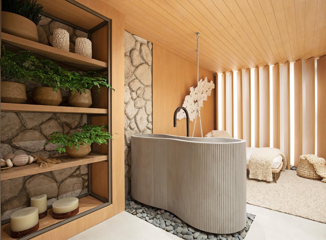 A curitibana Antonella e a carioca Fabricia têm em comum uma pai xão pela arquitetura que vem desde muito cedo e iniciaram a carreira em 2006, com atuação nos segmentos de arquitetura e interiores, e projetos no Paraná, Santa Catarina, São Paulo e Rio de Janeiro. A dupla estreia na Mostra Artefacto com um banheiro funcional e circulação, de aproximadamente 25 metros quadrados, um SPA sensorial para mo mentos de relaxamento e descompressão do dia a dia. Inspiradas por Burle Marx e Niemeyer, elas apostaram na mescla de materiais, textu ras e acabamentos para aguçar os sentidos. “Trabalhamos a visão com cores e iluminação que aquecem e aconchegam o ambiente; o olfato com aromas agradáveis para criarmos experiências únicas; a audição através de um som que transmite tranquilidade para relaxamento; o tato com texturas e tecidos que traduzem o conceito rústico com apelo sofisticado, tecidos leves e composição que reforçam essa sensação de acolhimento”, revelam. Para elas, “a Artefacto tem um design atempo ral, pontualidade na entrega, qualidade e personalização de acabamen tos que traduzem projetos únicos, sem deixar de lado o pós-venda e o atendimento exclusivo”.