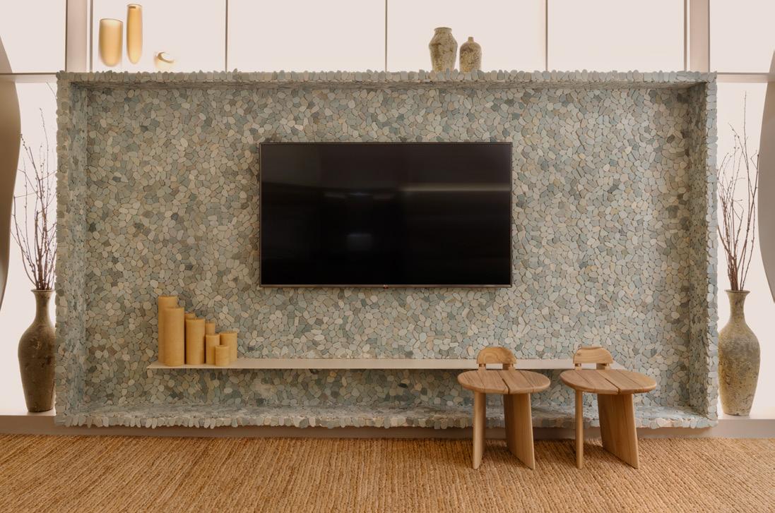 Arquiteta, mãe, esposa e empreendedora, Mariana Pesca dedica-se a criar projetos personalizados e funcionais. Para a Mostra, apresenta um quarto multifuncional onde a arte é maximalista e integrada: paredes em quartzito escovado com ripado rústico dialogam com painéis curvos de madeira aroeira em forma de abraço, iluminados indiretamente. Obras exclusivas de Carolina Kroff e Marlene Zanchett (série “Diálogos Visuais”) inspiram o espaço como se fosse o ateliê da artista, para pesquisa, criação e relaxamento. A arte é essencial na vida de Mariana, guiando escolhas que trazem aconchego e exclusividade. Surgem linhas arredondadas nos móveis da Artefacto, como a poltrona Carrie, o sofá Eos, a mesa de centro Ginza e a estante Apex, todos encaixando-se perfeitamente. Mariana deseja que “a pessoa explore detalhes nas entrelinhas, sinta vontade de ficar e queira o espaço para si.”