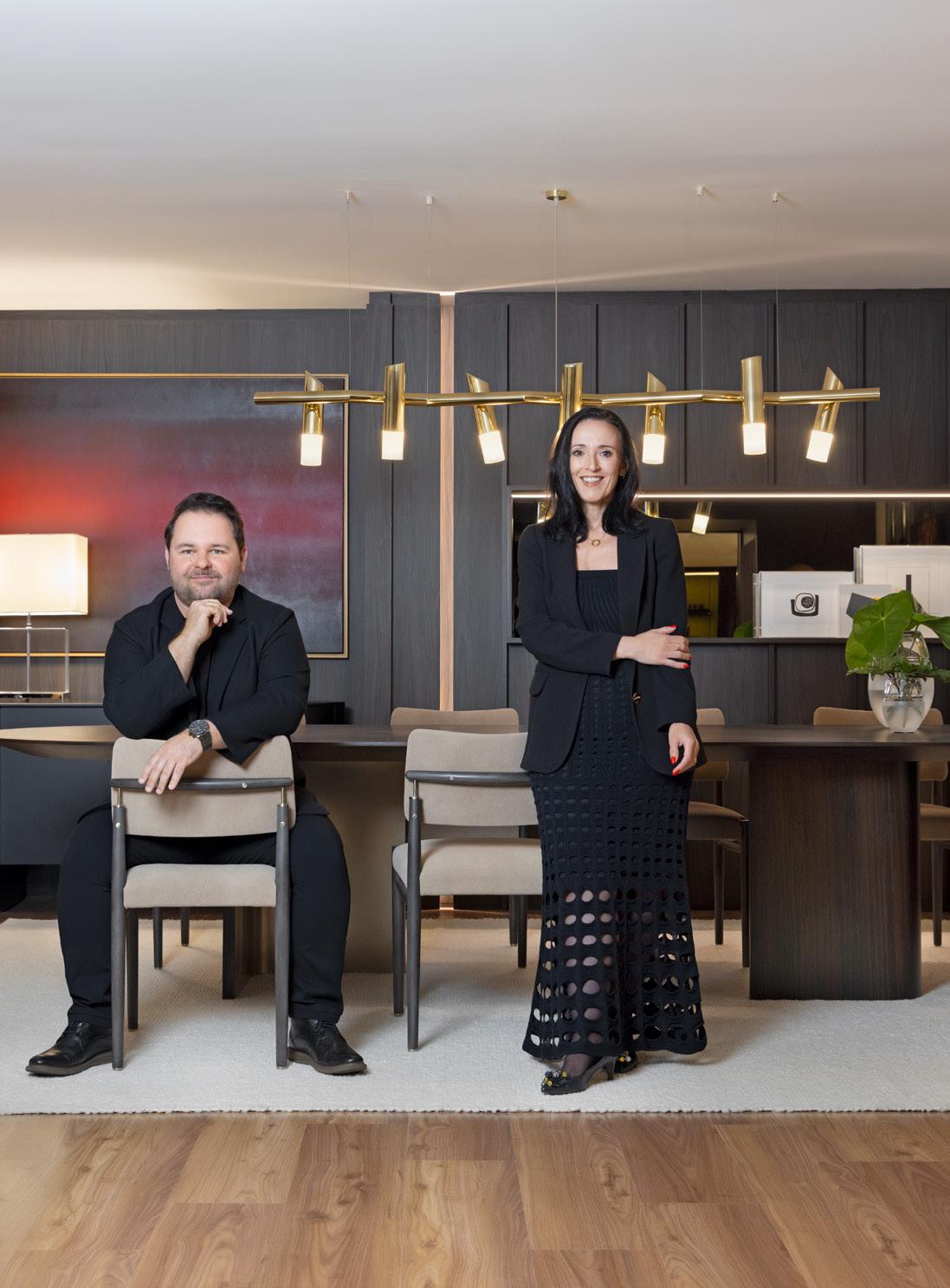 Cris Passing e Anderson Schüssler unem expertise em design de interiores para criar projetos atemporais e funcionais no estúdio PS Arquitetos, com uma trajetória que enfatiza a harmonia entre estética e praticidade. A arte, para a dupla, é uma expressão de sentimentos que instiga e aprofunda o envolvimento, transmitindo algo agradável pelo olhar, tato ou composição. Sem referências específicas artísticas ou filosóficas, o equilíbrio entre estética e funcionalidade surge da preocupação sustentável – reaproveitando marcenaria e piso do ano anterior –, com um hall marcante que aprofunda o olhar respeitando circulações. Os móveis da Artefacto, como o sofá Geta com encosto vazado e poltronas Pollux visíveis de todos os ângulos, foram chave para uma composição elegante e atemporal. “Queremos que o visitante sinta elegância, conforto e acolhimento, instigando o desejo de viver bem”.