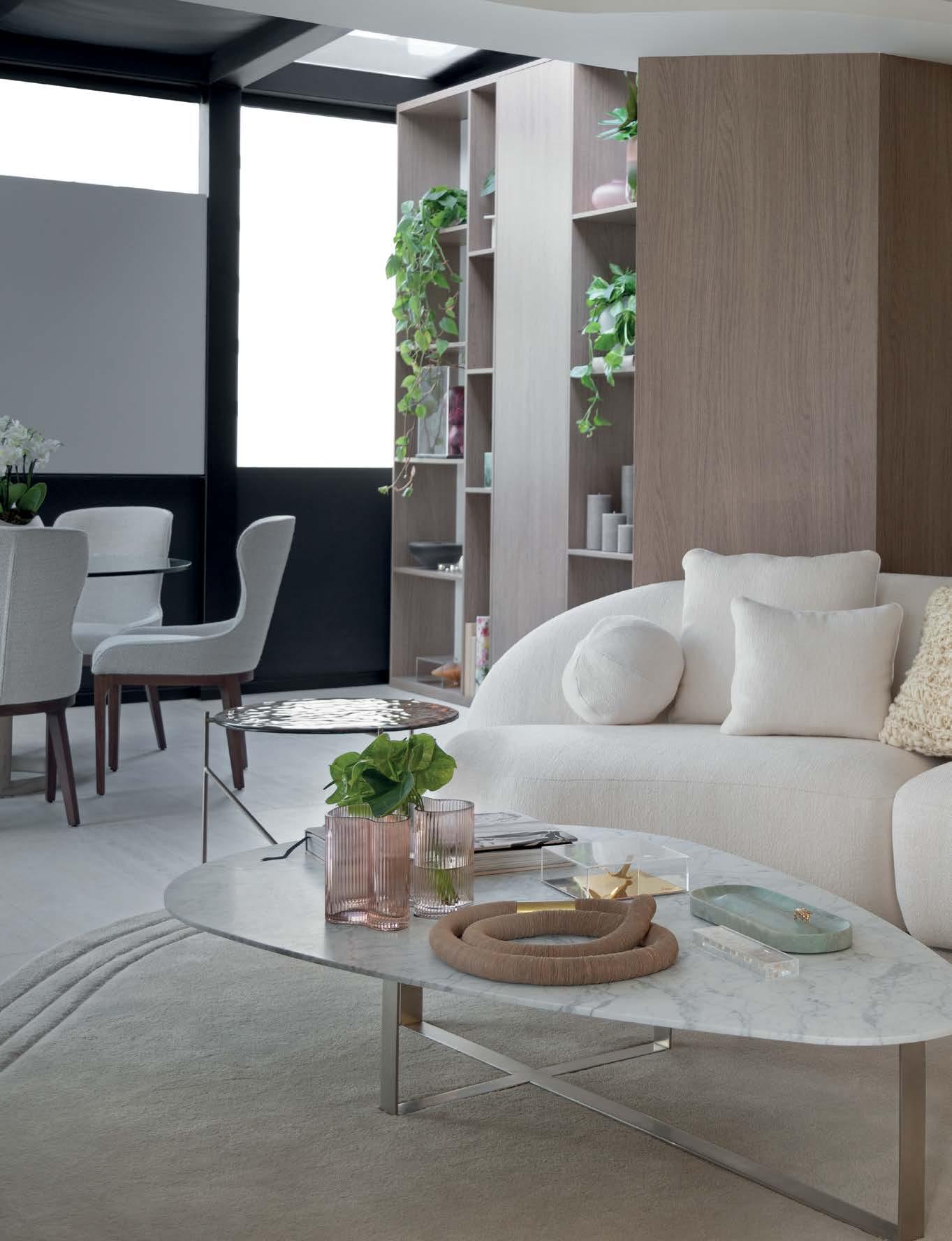 Mariana Maran sobre o módulo opus, ao lado da mesa de centro halston e da mesa componível niki Na página anterior, banqueta flicker , mesa de centro halston
