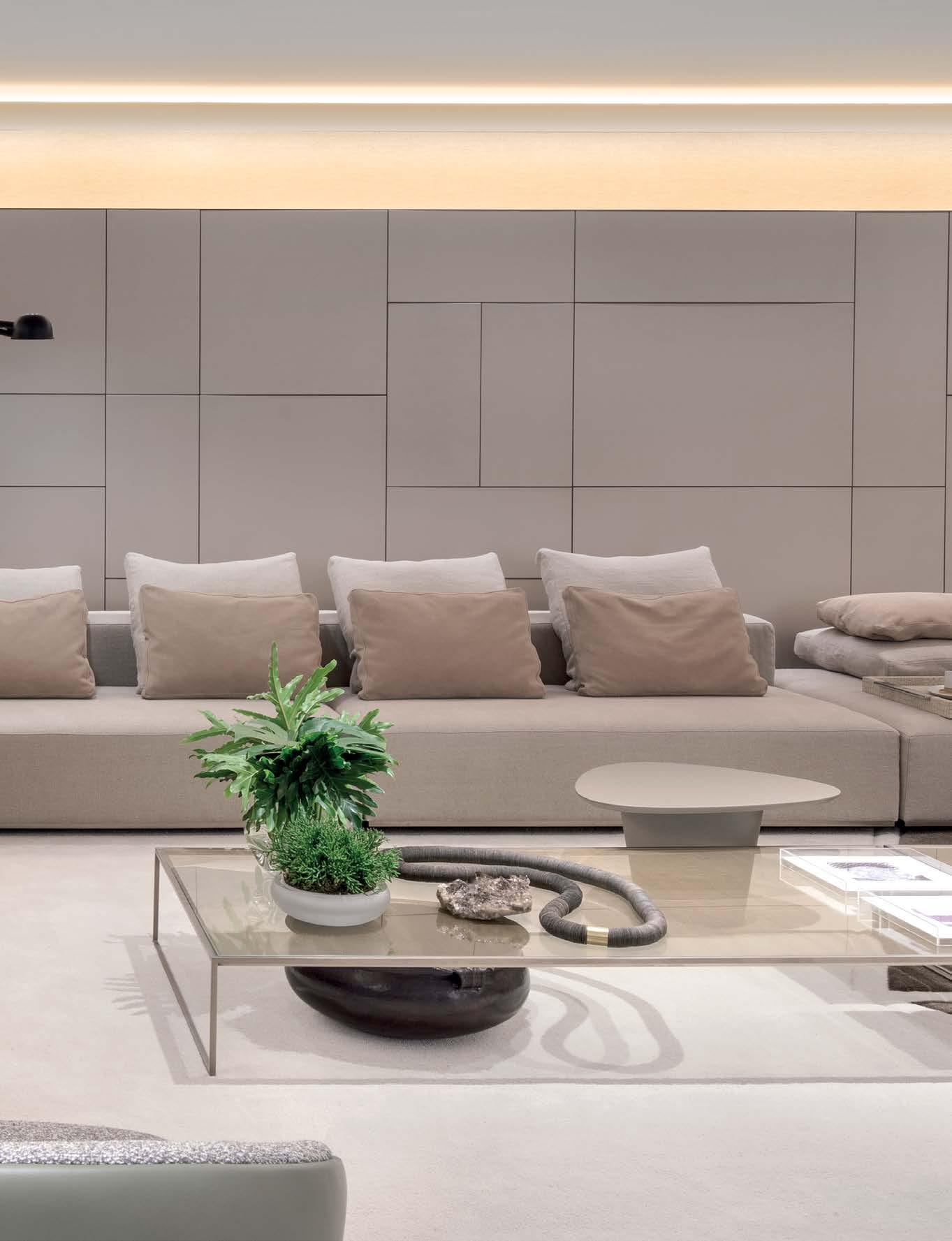 Sofá geta , mesa lateral fylla , mesa de centro ginza , puff mentha . Na página anterior, Fabio Morozini sobre o sofá geta e puff mentha
