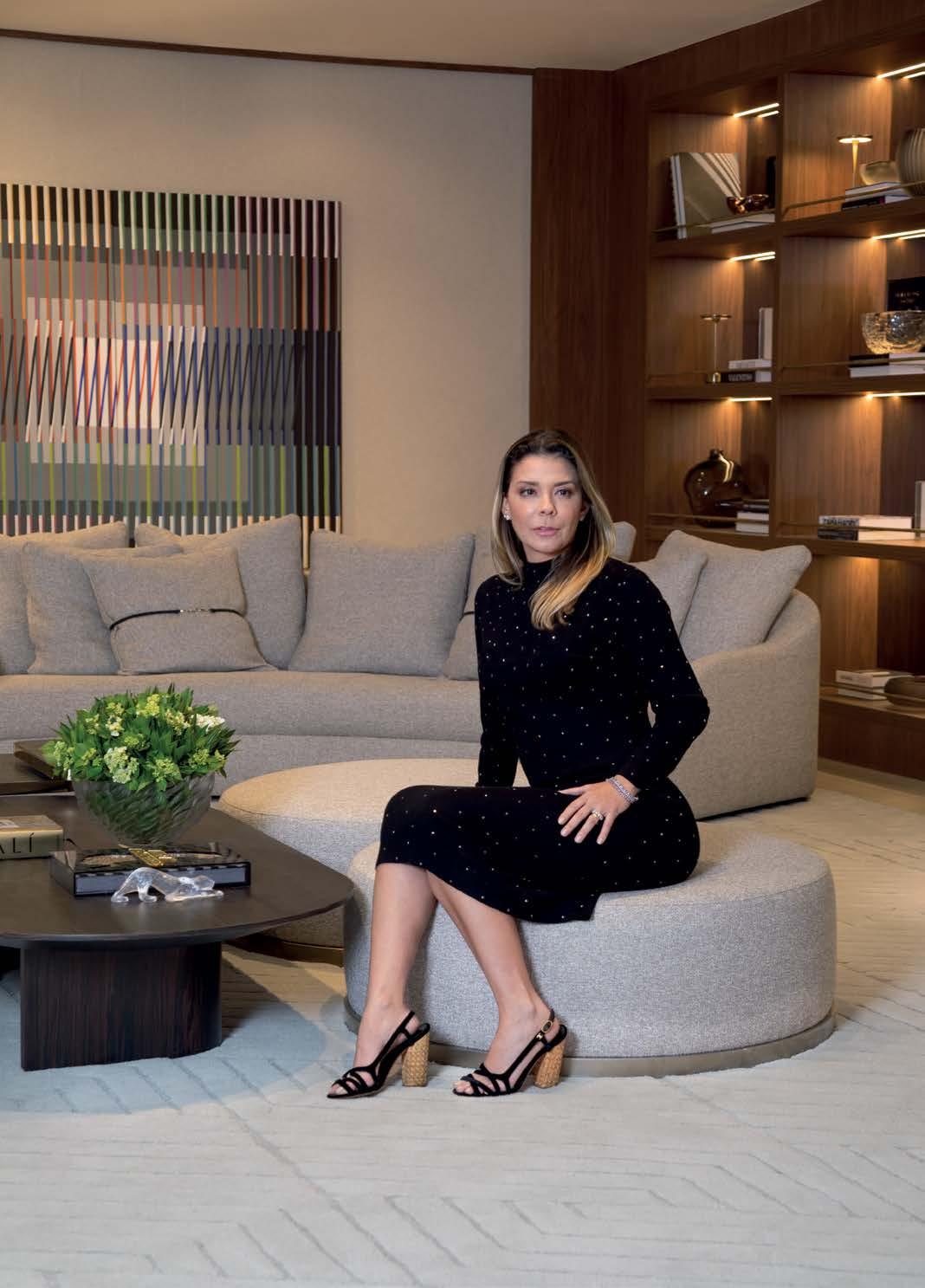Juliana Meda sobre o banco vivika, a mesa componível brass e a cabeceira piet Na página anterior, poltrona mentha , mesa de jantar versa