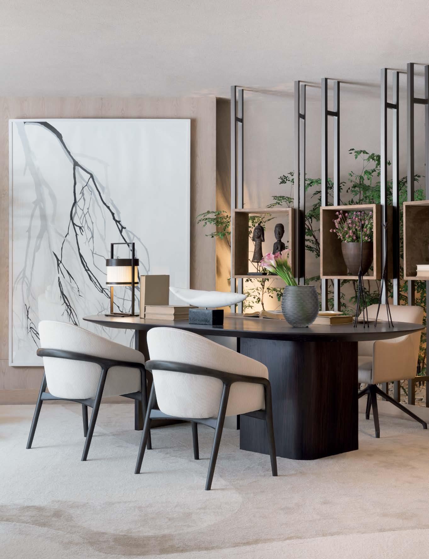 Cadeira nor , coluna de jantar moon , sofá piero , moldura aka Ao lado, poltrona pol , puff pol . Na página anterior, cabeceira harrison , banco maxim