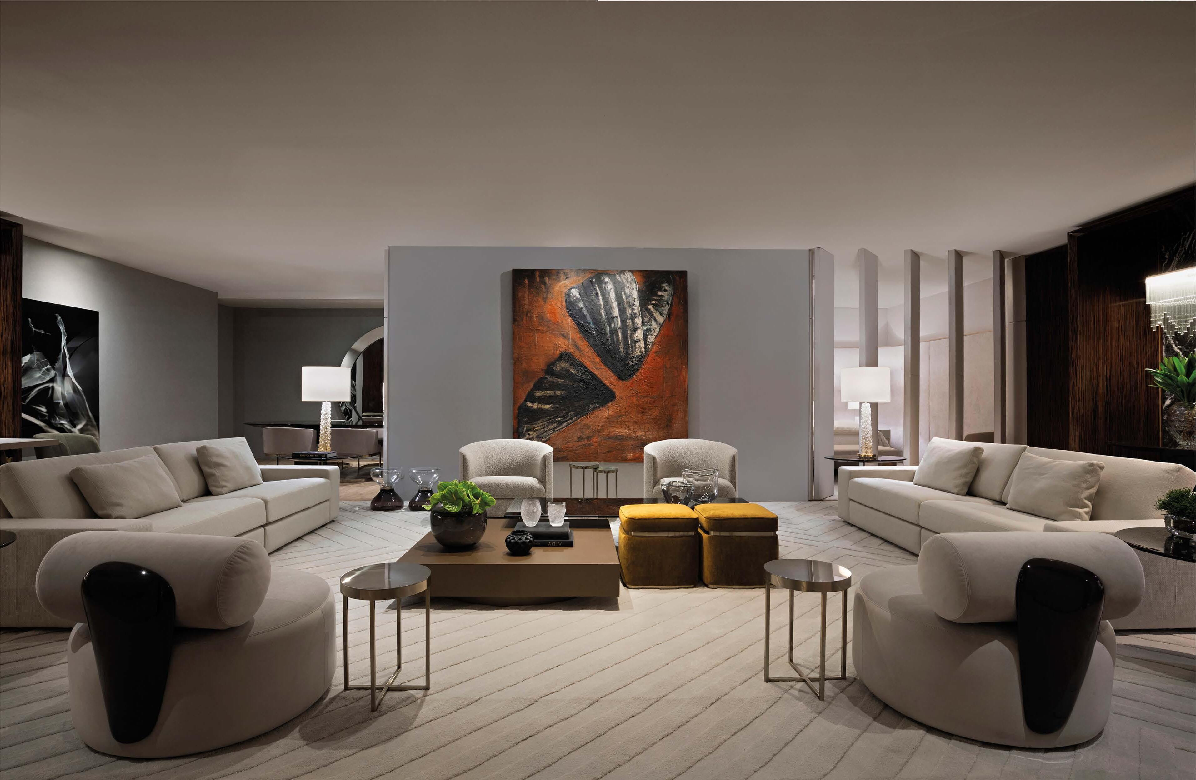 “Em meu projeto procurei contemplar as duas dimensões do doutor Rollemberg: a do médico, que necessita de condições ideais para refletir e tomar decisões importantes. Mas também a do homem, sensível e elegante, que deseja viver em um ambiente harmônico e bem mobiliado”, explica Erika, que tem na construção de uma base em cores neutras, e na exploração de texturas diferenciadas, dois dos pilares de seus trabalhos. Uma opção definitiva pelo bem estar, que determinou, por exemplo, o posicionamento de móveis como o módulo Maddox, que abraça o living e atende ao home theater. Ou ainda da cama Nouveau, que, com toda a sua imponência, domina o desenho do dormitório, em composição com a escrivaninha Regia. Na medida exata da sofisticação e do conforto.