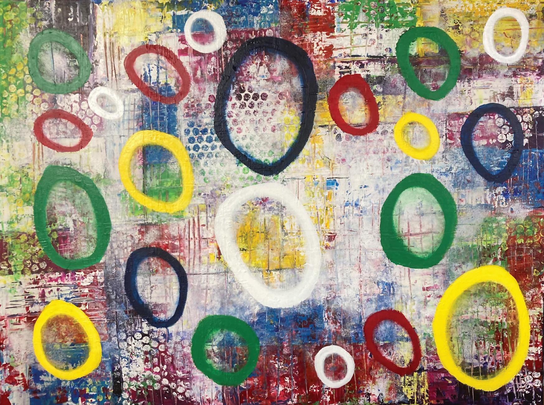 Samantha explores the interplay of shapes and colors to evoke a sense of interconnectedness. She seeks to convey the beauty and complexity of the relationships that bind us together. Each shape is divided into smaller elements that form intuitively patterned layers.