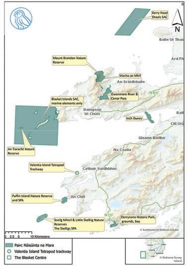 e National Park is situated in Co. Kerry and the newly acquired sites include the Conor Pass, the Owenmore River, Mount Brandon and sand dune sites at Inch Peninsula. Other sites within the park include Little Skellig and Pu n Island, both managed by BirdWatch Ireland as well as several areas managed by the O ce of Public Works (OPW) such as Derrynane House, historic park and beach, Sceilig Michíl and land on Great Blasket Island. An Tiaracht Nature reserve, managed by the Commissioners of Irish Lights is also within the park as well as Valentia Tetrapod Trackway. e marine aspects of the park include the waters around the Blasket Islands and Kerry Head Shoals which host ecologically important limestone reefs.
