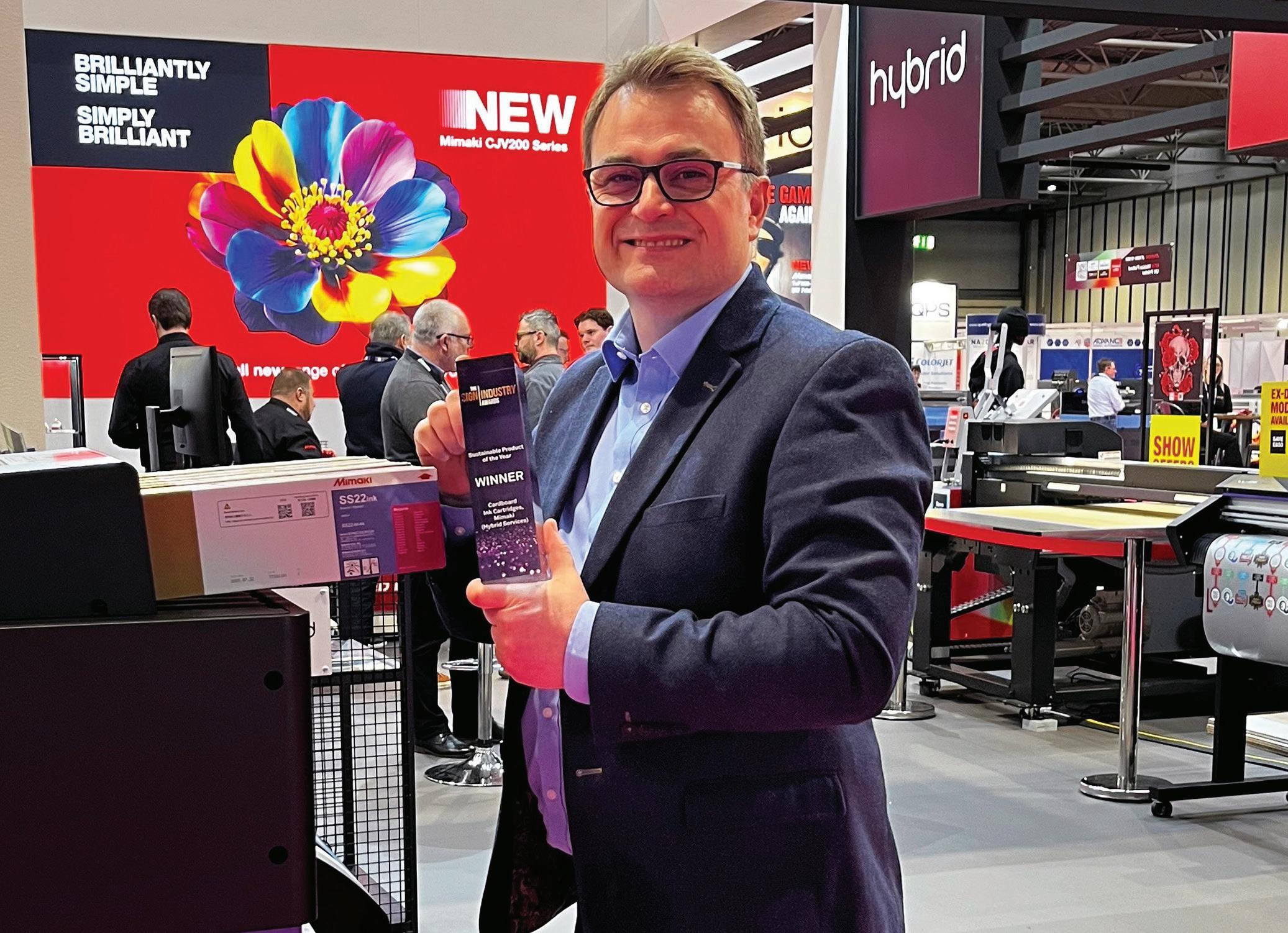 Mimaki took home the Sustainable Product award at the Sign Industry Awards 2025, held alongside Sign & Digital UK. The award was for its cardboard ink cartridges, which reduce plastic waste without compromising performance and have been developed as an alternative to traditional plastic ink cartridges. The cardboard cartridges are available for an increasing number of ink types, including the newly introduced SS22 Sustainable Solvent inks. Offering a GBL free solution, Mimaki says its SS22 inks deliver the same high-quality output with a lower environmental impact, making it an attractive choice for sign and graphics companies looking to improve sustainability in their operations. Hybrid Services’ Sales Director Andy Gregory said: “ Sustainability is an increasingly important consideration for our industry and innovations like this show that real progress is being made. We’d like to thank everyone who voted for us – it’s great to see such strong support for positive environmental change in print.”