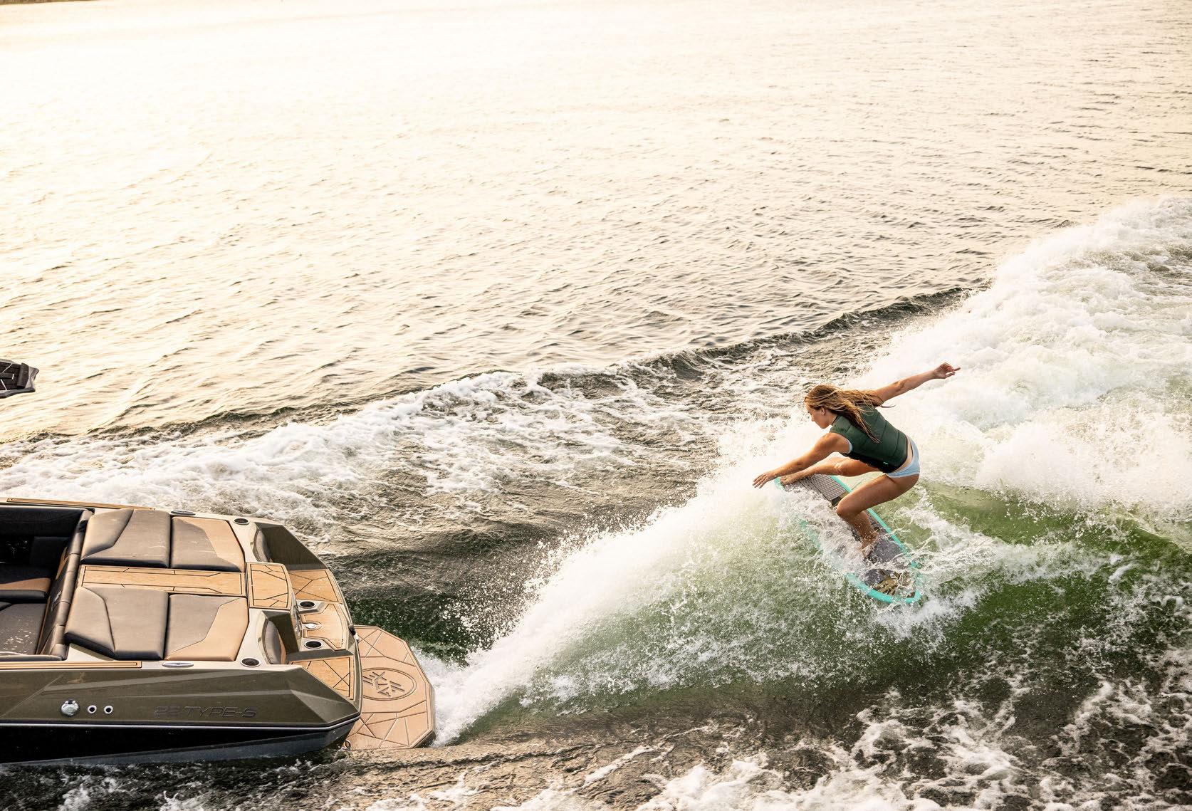 a rocker shape like a wakeboard or slalom ski. ATX uses its breakthrough TAPS technology to control hull running attitude and wake characteristics. At wakeboarding speed with TAPS in the up position, the bow rises and the Convex V hull settles naturally, creating tremendous water displacement and huge worldclass wakes without ballast or drag hardware. A push of a button adjusts TAPS down, lowers the bow and creates instant planning and slalom type wakes.