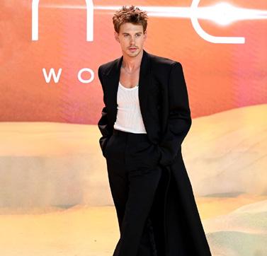 Austin Butler vistió un traje de tela de lana negro de Gucci Otoño-Invierno 2024, una camiseta sin mangas de punto blanca, un abrigo de tela de lana negro y botas de cuero negras en el estreno mundial de “Dune: Part Two”, celebrado en Leicester en Londres.