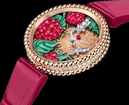 Los nuevos relojes Perlée Extraordinaire Fruits Enchantés Framboise y Myrtille de Van Cleef & Arpels celebran la belleza de la naturaleza transformando jugosas bayas en delicadas obras de arte en miniatura. Gracias a la innovadora técnica de esmalte modelado, desarrollada y patentada por la Maison, cada fruto luce un volumen brillante y realista que resalta sobre un fondo de oro texturizado, rodeado de un follaje pintado a mano y engastado en un marco de perlas de oro. Cada reloj muestra, además, una pequeña hada de oro rosa o blanco con alas engastadas de diamantes, jugando entre los frutos y recordando la poesía del tiempo que pasa. El reverso está adornado con un grabado especial: una mariquita para la versión Framboise y una mariposa para la Myrtille, un refuerzo a la fantasía y el savoir-faire que distinguen a la Maison.