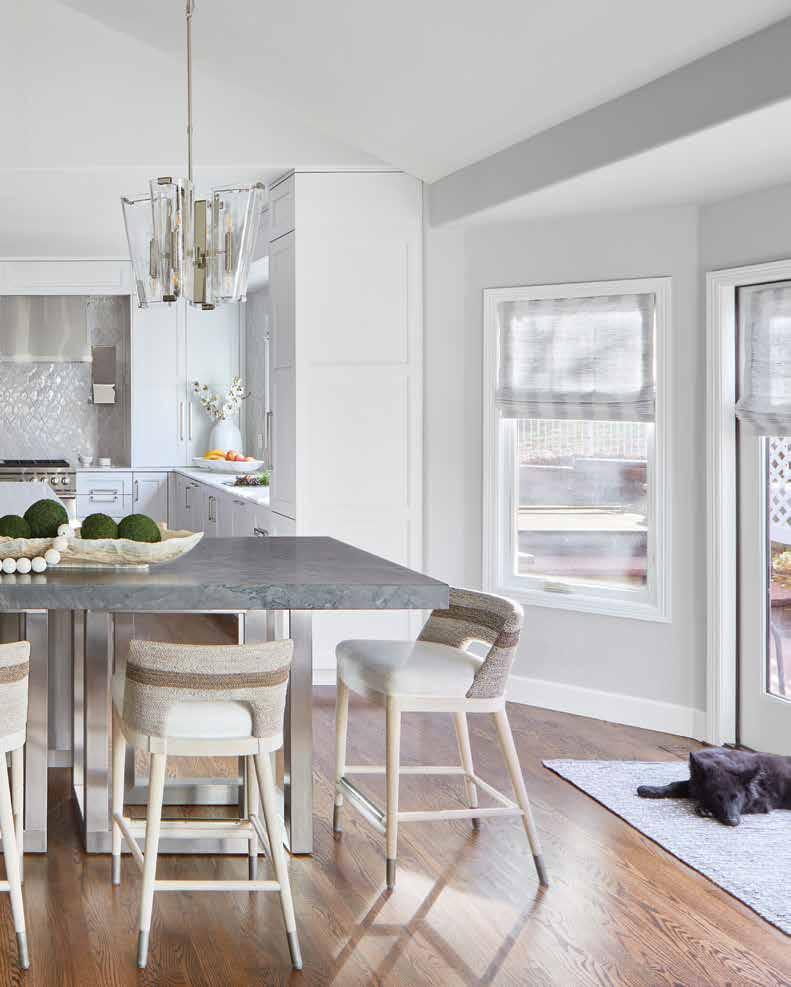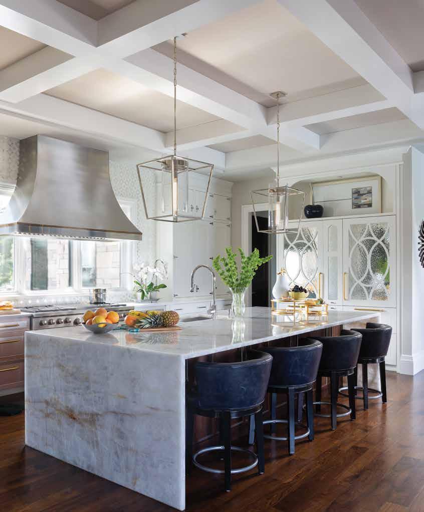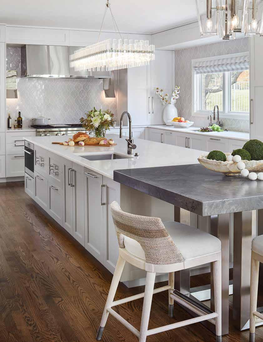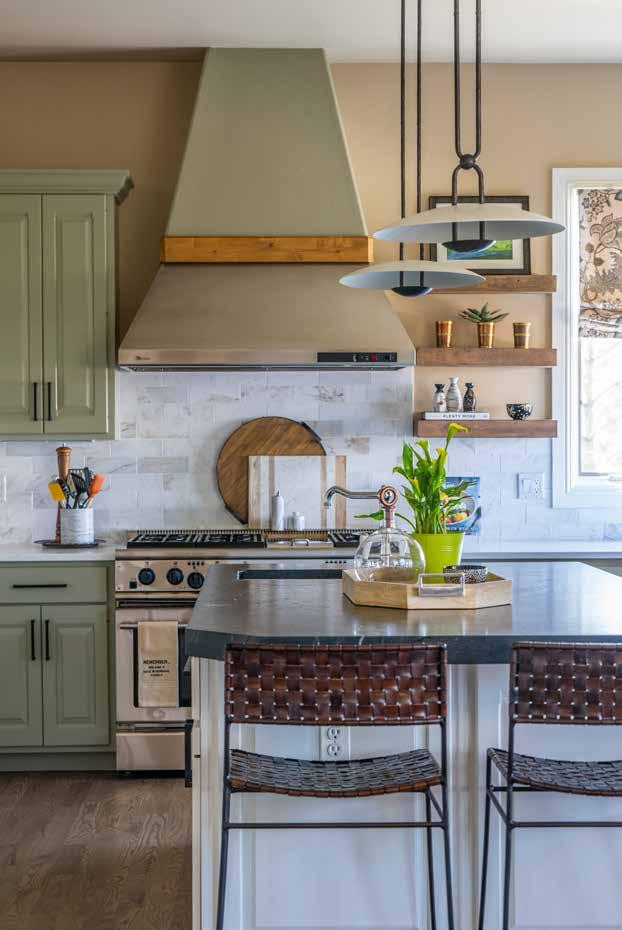 TRANQUIL TRANSITIONAL Photography by Katy Jo CaringerFor this kitchen refresh, Julie Greiner, principal, and Kathy Siple, senior designer, at JRG Design, wanted to create a “functional, user-friendly kitchen while keeping it interesting and timeless,” Greiner says. “The soothing sage green cabinets with the timeless Carrara marble create a kitchen where you want to spend time!”