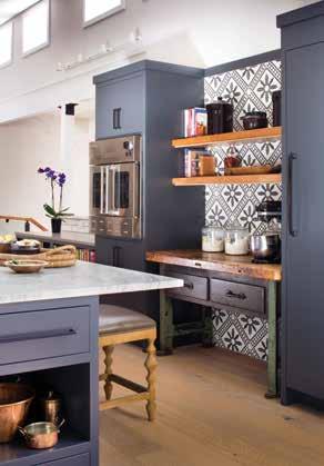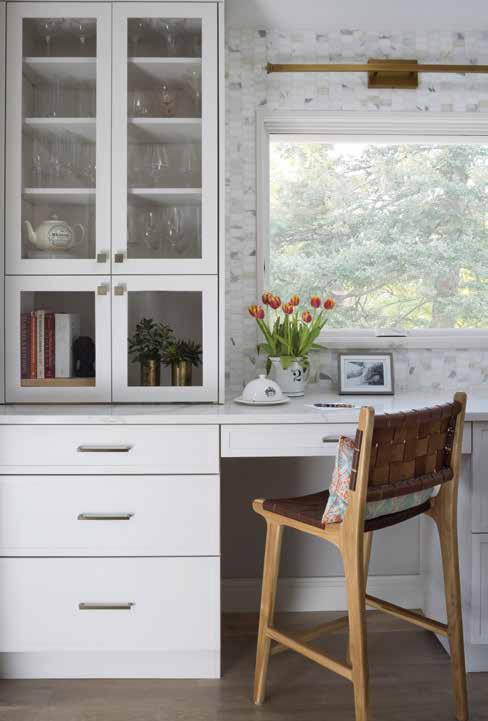 Based on the clients’ original kitchen, it was clear to Wilkinson that the family needed a place for mail to drop, laptops and cell phones to be charged and meals to be planned. So, she resurrected a somewhat forgotten kitchen design element—the kitchen desk. Some older designs would tuck it away in its separate space, but here the desk is the same height as the rest of the perimeter cabinetry, so when it’s not in use as a desk, it can do double duty as additional prep space. “I also think that families like having a place for kids to do homework, where it’s visible to the active kitchen area in the mornings and evenings for supervision,” she says.