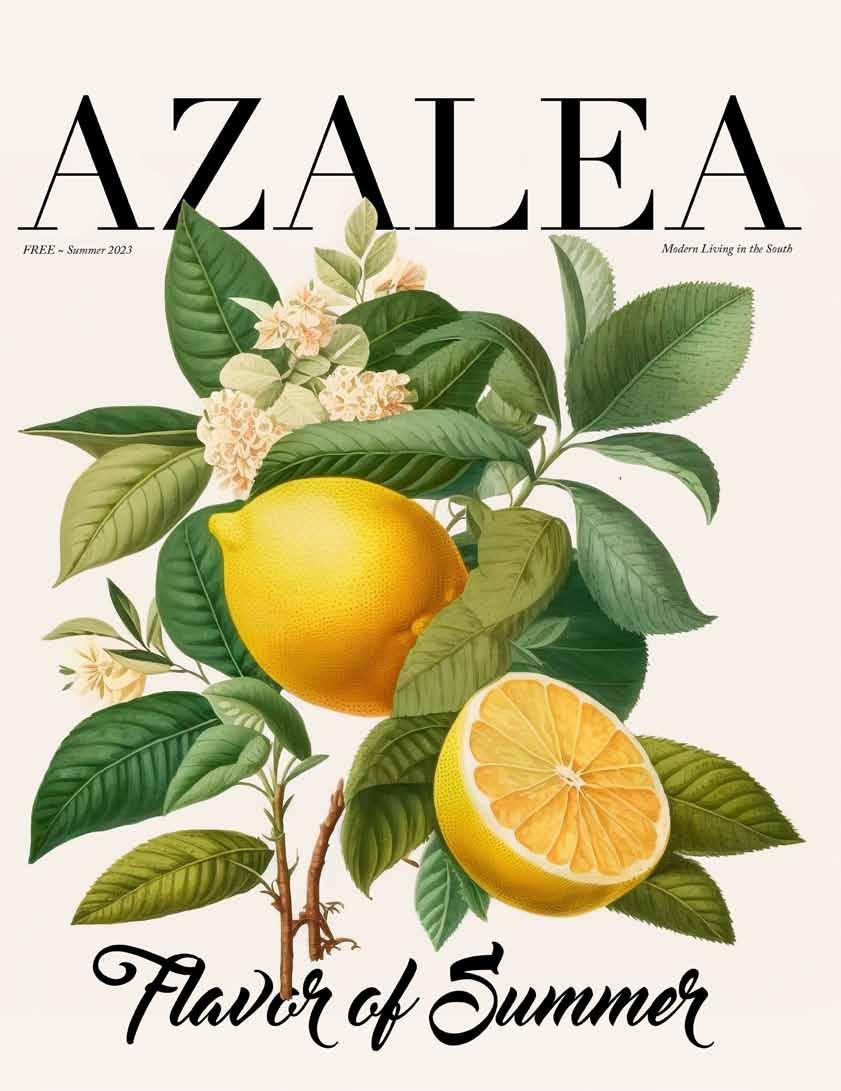 AZALEAMAG.COM Summer 2023 6 06 Editor’s Letter 10 Contributors FIELD GUIDE 11 Surfing 12 Landscape 14 Q&A 16 Landscape SOUTHERN LIFE 19 Southern Spotlight - Food 25 Southern Spotlight - Food 35 Southern Spotlight - Sports COLUMNS 35 Natural Woman by Susan Frampton 39 Kids These Days by Tara Bailey 43 Life & Faith by Will Thompson THE VILLAGE POET 64 Out of the Blue 35 On the Cover: A vintage botanical illustration of lemons. 25 19 33