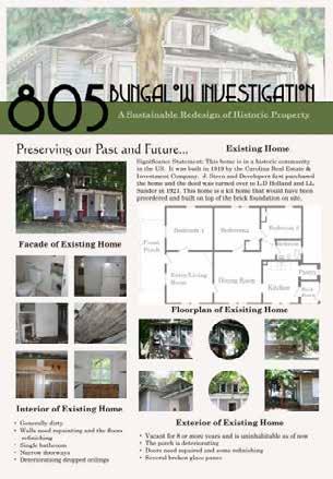 Basic lessons in measuring, photography and site documentation were reviewed prior to the visit and HABS guidelines for informal field documenta tion were established. We were very grateful to the University for granting us access to the six homes when we needed it and created inspiring new hypothetical designs that may prompt future rehabilitation of the homes. The process was recorded for transparency on a public accessible blog and the final presentations were open to the public. Each team had to include a sustainable product in their specifications and explain their justification.
