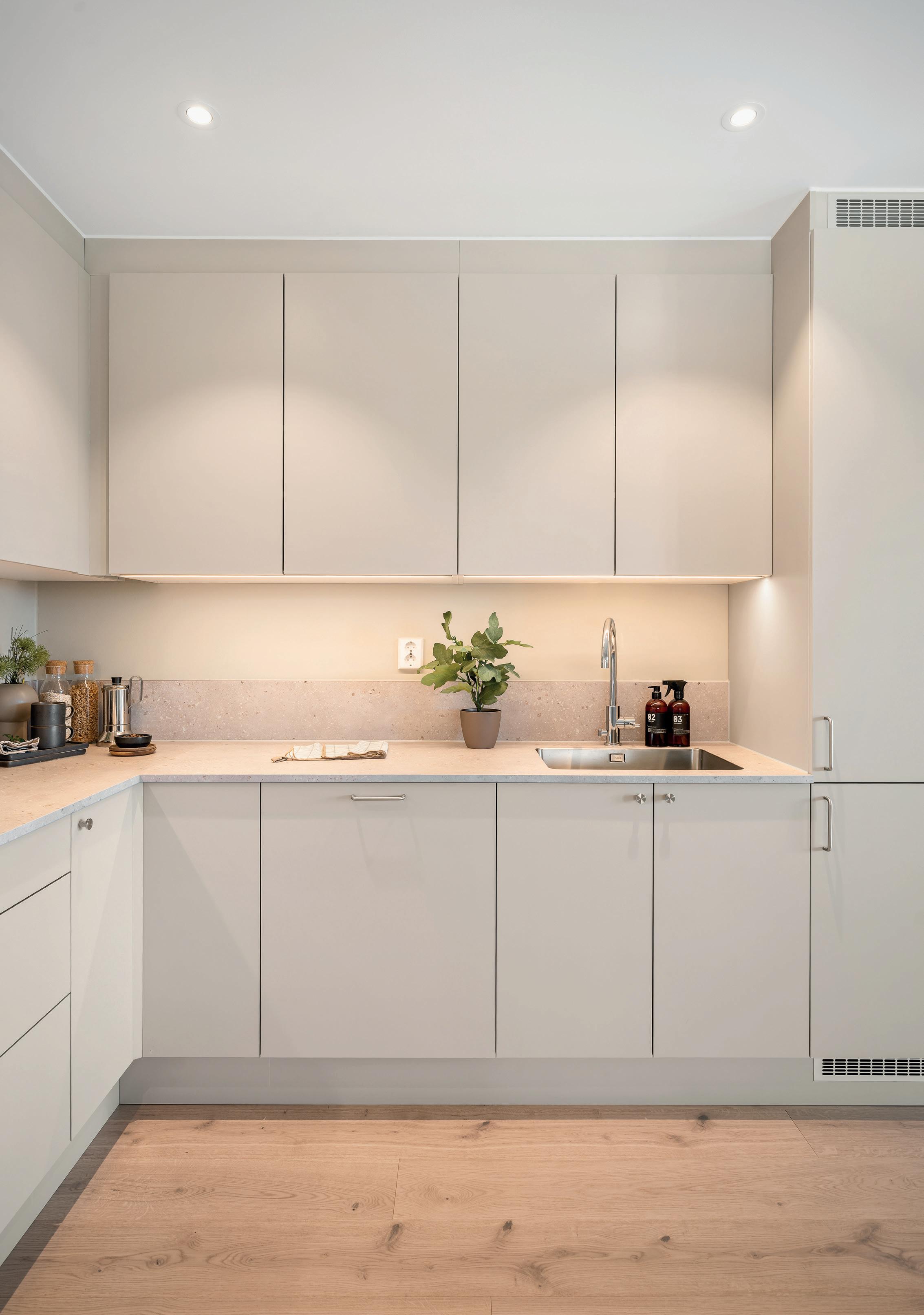 • 20mm laminat benkeplate med F32 forkant i 652 Sandsten med underlimt vask Intra Frame FR520.