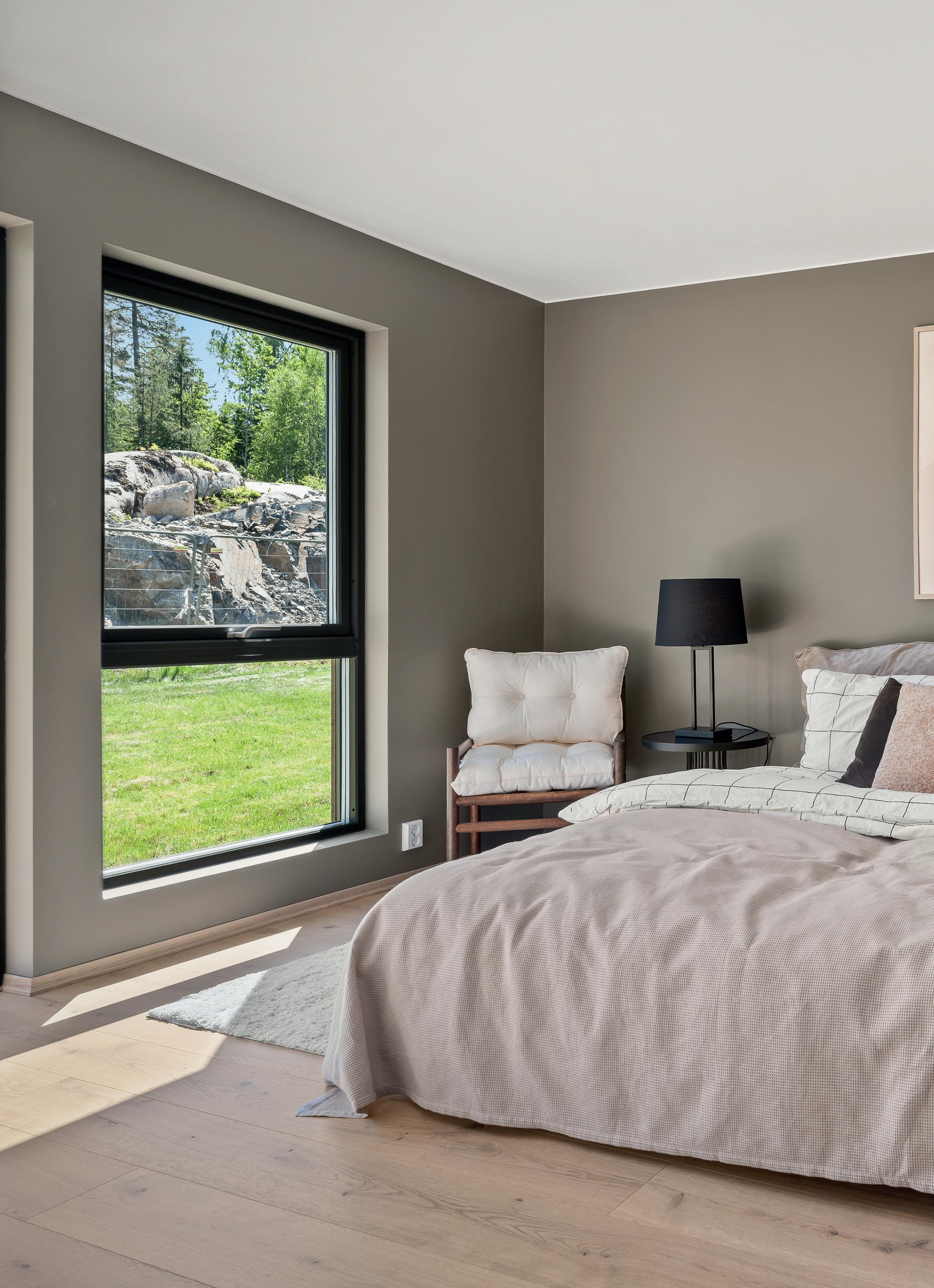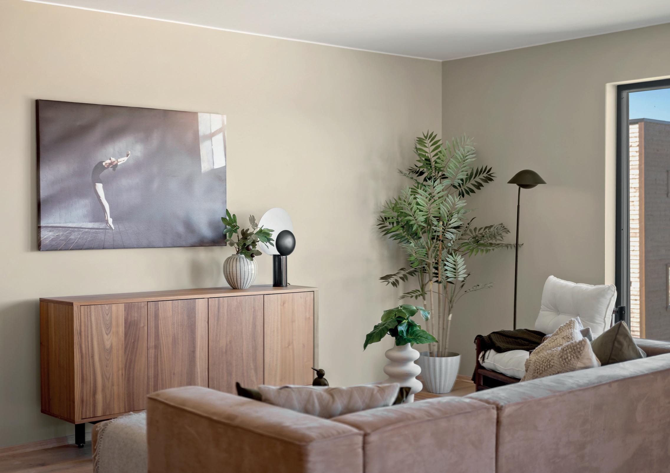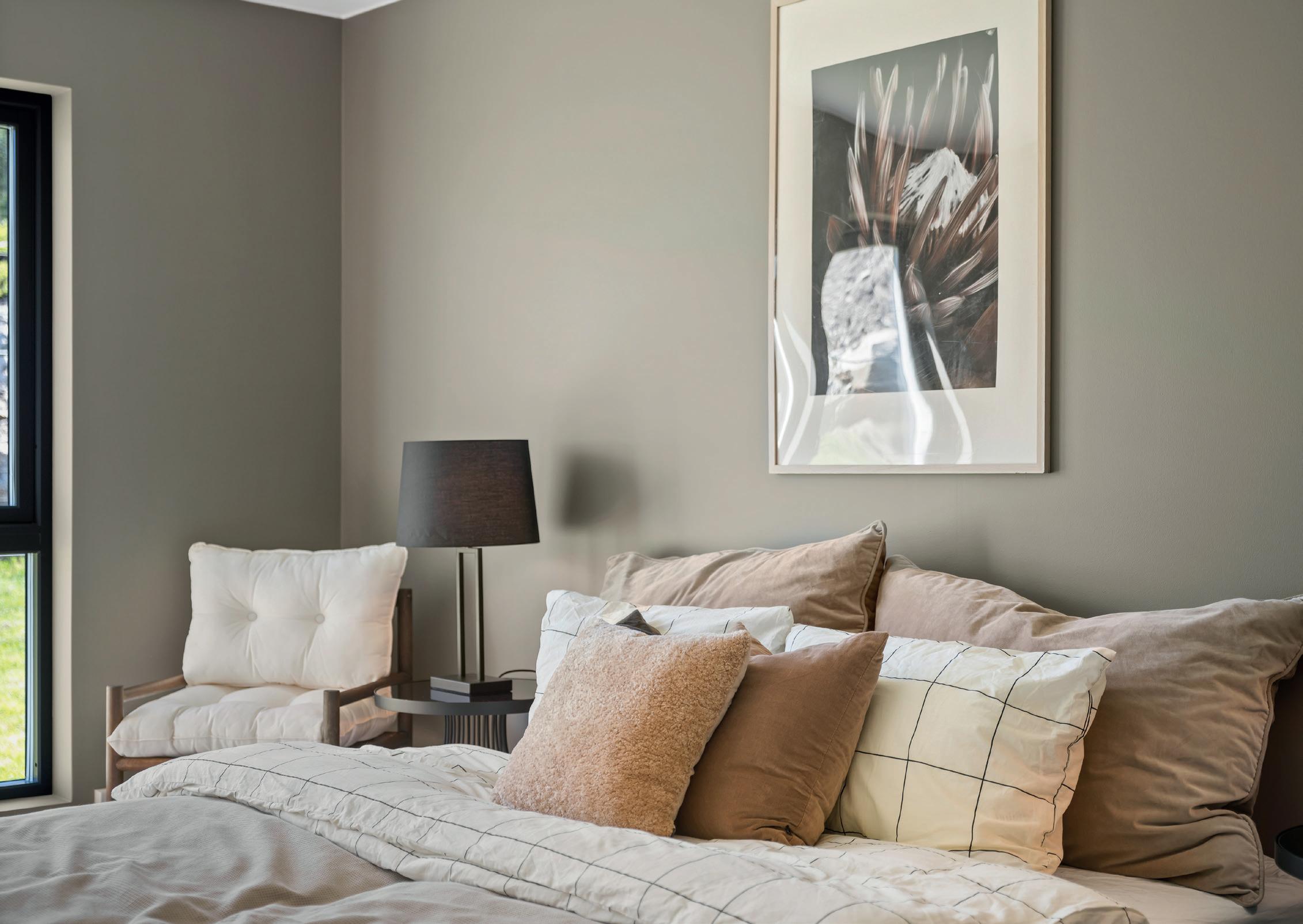 • Alle vegger i ganger, trapperom, stue og kjøkken er malt i fargen «Blek Sand NCS S2005-y20R». Vegger hoved soverom i plan 2 er malt i fargen: Comfort NSC-5504-Y24R.