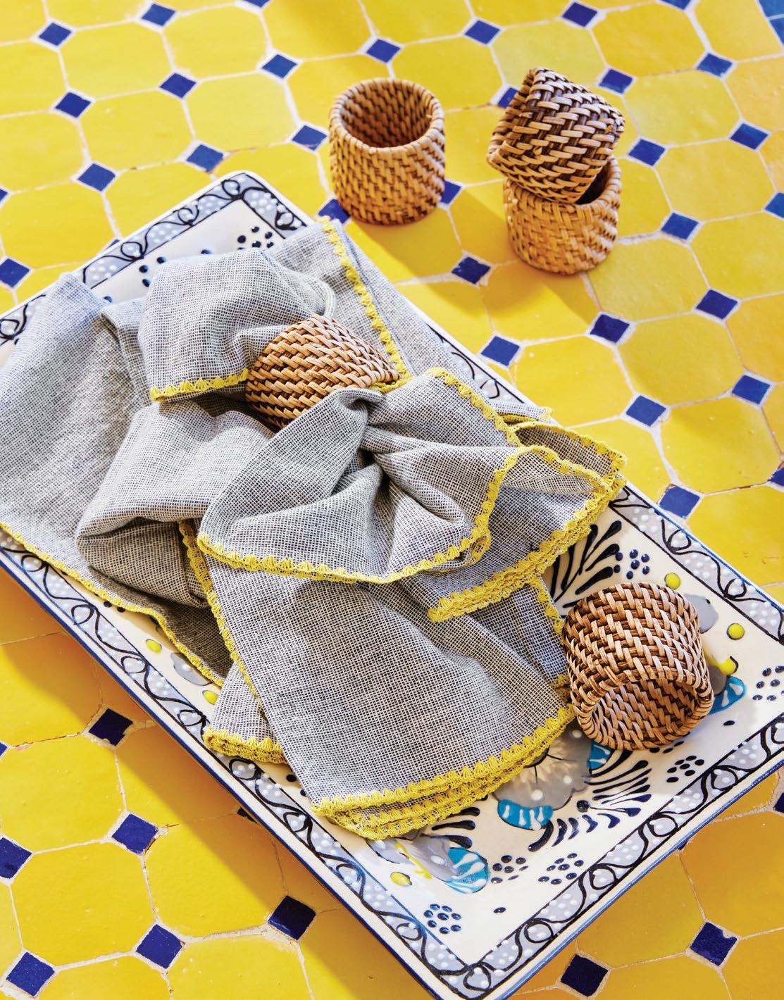 Designer Barclay Butera adds floral flair to the courtyard. The pool area presents guests the opportunity to take in city and water views.Barclay’s relaxed gatherings commence with what’s perhaps tequila’s most popular achievement, the margarita. Here, it’s served in iconic Mexican glassware with cobalt blue rims. Tiles throughout the interiors of Villa Blanca influenced the marriage of colors in the table setting for the occasion. Sunny yellow scalloped trim adorns linen napkins in a natural oatmeal hue. Gazpacho verde achieves its fresh green color from a delicious blend of spinach, avocados, cucumber, celery, cilantro, green onion, lime juice, salsa verde, and papaya.