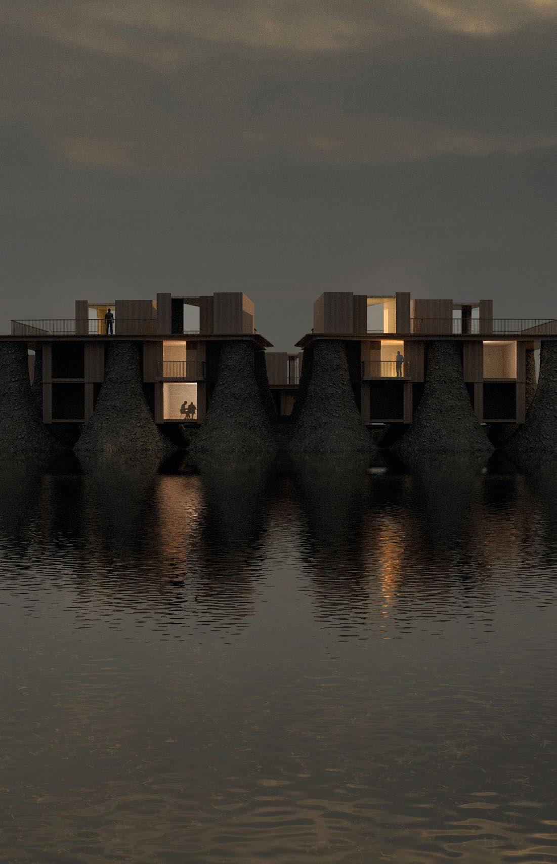 12.26, 12.28 Siqi (Suky) Ouyang, Y3 ‘The Visitors’ Hotel’. The hotel provides three different styles of accommodation. A capsule hotel and larger-scale hotel rooms face onto the public square, supporting the transient freeport users and low-rise, detached cabins that dissipate into the picturesque marshland to accommodate bird enthusiasts. The construction utilises Ferrock as a cement substitute, reducing carbon emissions and ecological impact. The incorporation of rammed earth and cross-laminated timber (CLT) further enhances the hotel’s integration with the local environment.