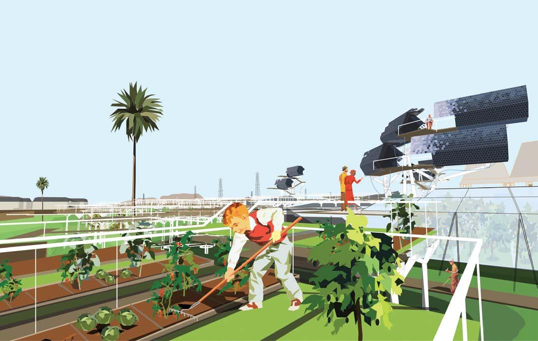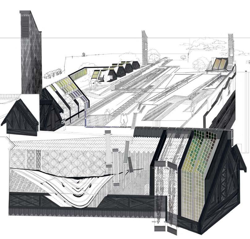 Tom Budd, Y2, The Inglewood Oil Field Community Gardens and Market are situated on the largest urban oil field in Los Angeles. The proposal provides residents with an agricultural superstructure specifically designed to house a diverse range of naturally grown produce. Using geothermal energy acquired from pumping water into unused, capped oil wells, the building creates steam, which it then uses to power and create spaces with specific temperature and humidity related qualities. The building lies on the boundary between the suburban community and the industrial oil field. These contrasting elements are reflected in the building’s design – the community gardens act as a bridge connecting people demonstrating the new ways in which it’s utilisation can be beneficial to the suburban community.