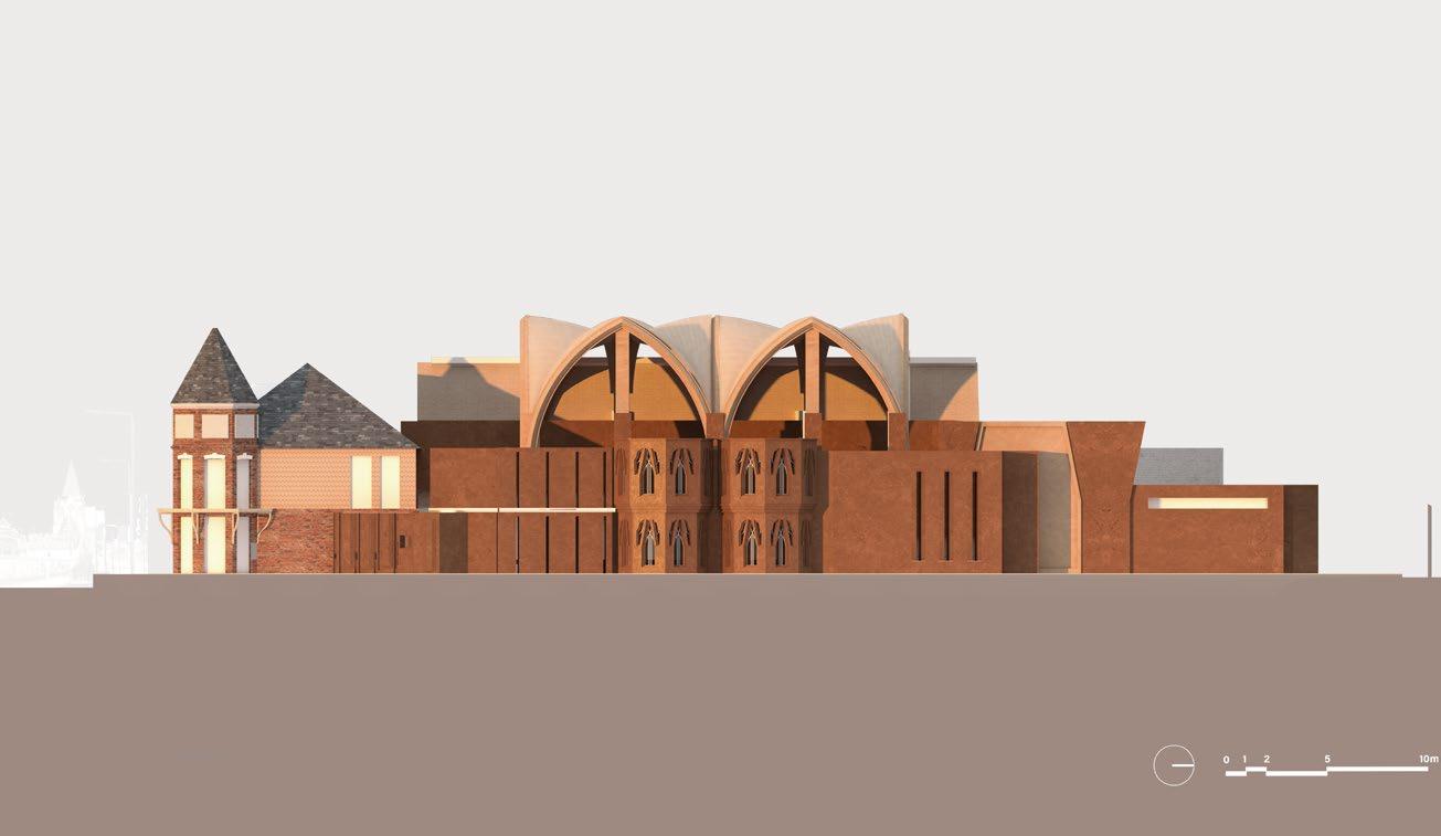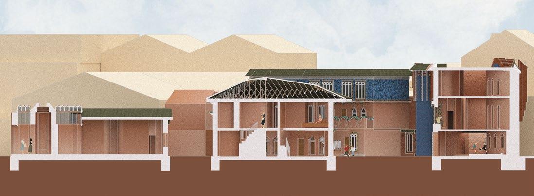 4.6, 4.20 Natania De-Marro, Y3 ‘The Panatorium Project’. Located on 12 Whidborne Street in Camden, the project renews a piece of its history, directing its purpose towards the young people of the area. The clients, London Music Fund and The Actors’ Children’s Trust, desire a building that caters to the largest demographic in the area: children aged 7–13. This project has multiple auditoriums for productions, plays and musical endeavours. The reuse of bricks as building aggregate in the façade allows a proposal that is homogeneous with its surroundings, assimilating to the existing context.