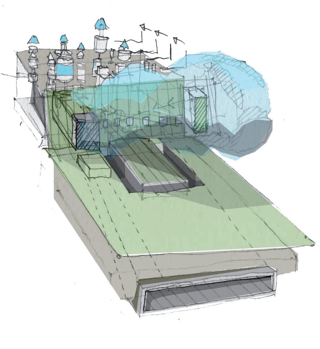 Fig. 4.13 Luke Scott, Reclaiming Hunters Poin – In response to the de-gentrification of a site previously known for it’s U.S naval shipyards and ‘blue-collar’ demographic, the project re-appropriates traditional camouflage techniques to avoid satellite detection. By occupying gaps in the new masterplan, the roof is designed to respond to the forecasted staged upgrades of Google Earth’s resolution over the next 5 years. The buildings undergo a process of ‘digital weathering’ in which their presence and the nature of their occupancy is gradually unveiled. Drawing of pixelated roof. Fig. 4.14 Luke Scott, Toxic Weathering – De-contamination Facility & U.S. Navy Debriefing Centre. Treasure Island, an artificial land mass originally constructed for the 1939 Golden Gate Exposition, is threatened by resurfacing of its subterranean nuclear