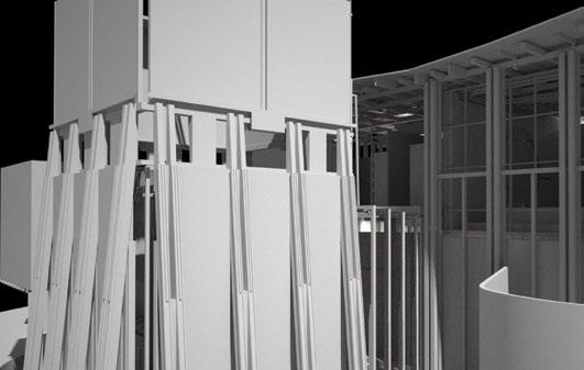 a framework for applying and simulation different material environments, while presenting a fragmented totem to the institution which plays with the large scale of its surroundings. Fig 4.19 – 4.23 Dan Scoulding, Y3, 1 North Mission. The scheme is a new transport hub for Downtown LA comprising a light rail station, office space and data centre. Through the mediation of light and heat across the massive superstructure of the scheme, a complex system of environmental conditions is maintained. The building is designed to respond to the Piggy Back Yard Conceptual Masterplan designed for the Friends of the Los Angeles river, which seeks to re-establish the waterway through breakdown of hard infrastructure and new green riverside developments. By taking the proposed 125 acre park as the instigator of a future site to come, the project