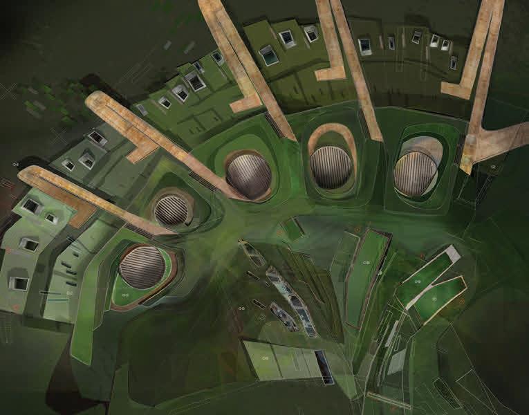 contamination. In a cleanup strategy the building probes the ground, drawing radioactive waste into suspended phyto-gardens, filtering and harvesting the contaminated land. Naval veterans engage in horticultural therapy to acclimatize to civilian life as contaminants trigger controlled throughout the sacrificial architecture.