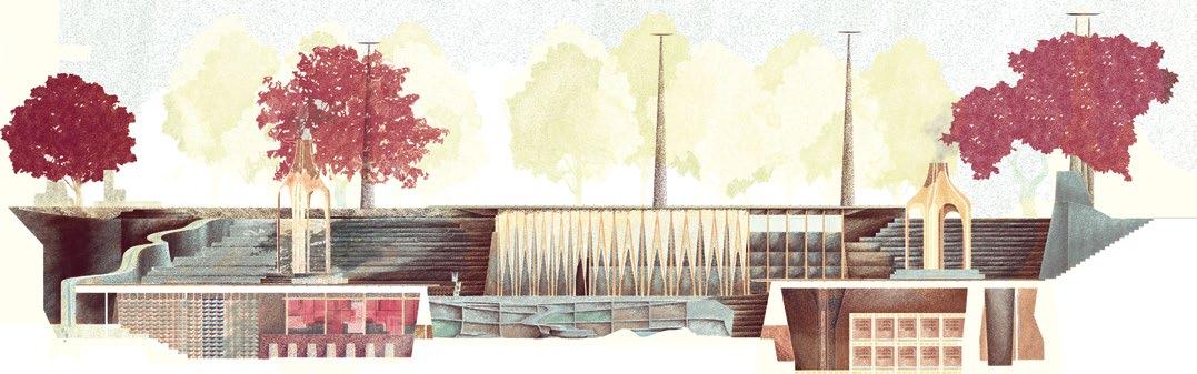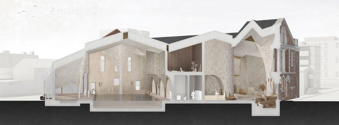 4.8, 4.15 Liana Lumunyasi, Y2 ‘Heritage Waters’. This project creates a fusion of contemporary bathhouses with Roman ruins. Visitors can enjoy the tranquil experience of a modern bath while exploring the archaeological remains below, providing a unique experience. The building represents a blend of practicality and cultural preservation, inviting visitors to appreciate the seamless union of different eras. The project emphasises a commitment to sustainability and history.