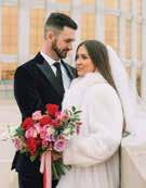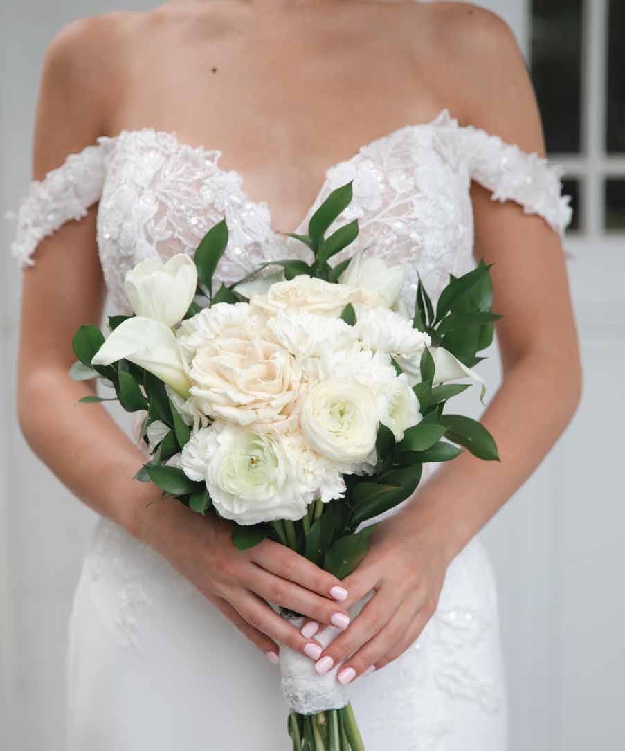 This bridal bouquet, featuring florals from Carlstedt’s, combines white tulips, peonies, calla lilies, and ranunculus, all elegantly tied together with a lace ribbon.