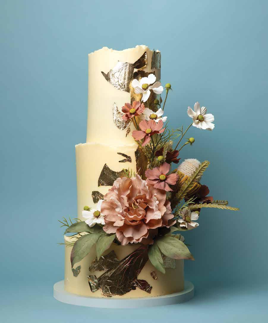 Thurman’s Food Factory created this beautiful four-tiered wedding cake with white buttercream icing and classic white cake. The intricate traditional piping adds a charming, old-fashioned touch in the best possible way.