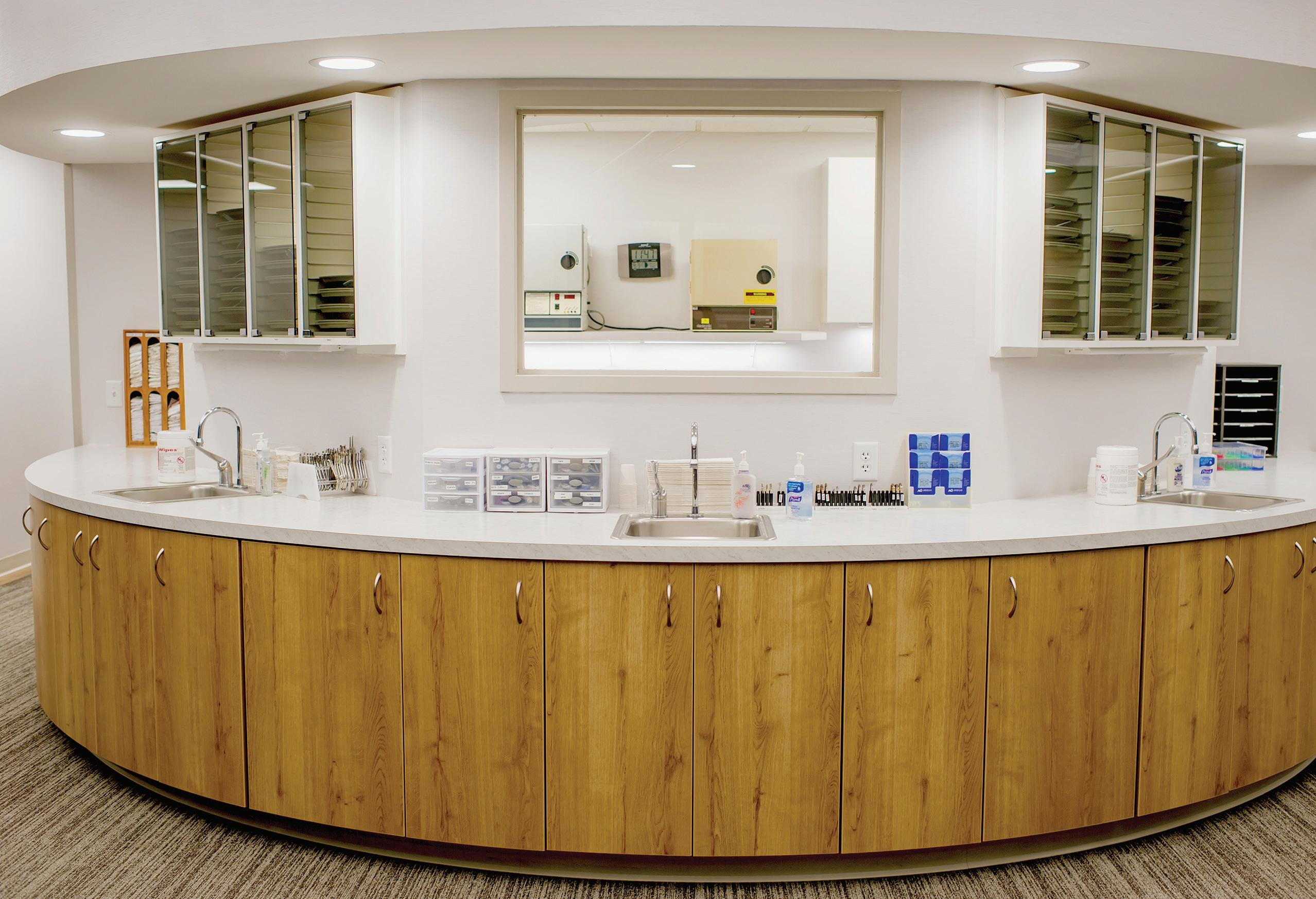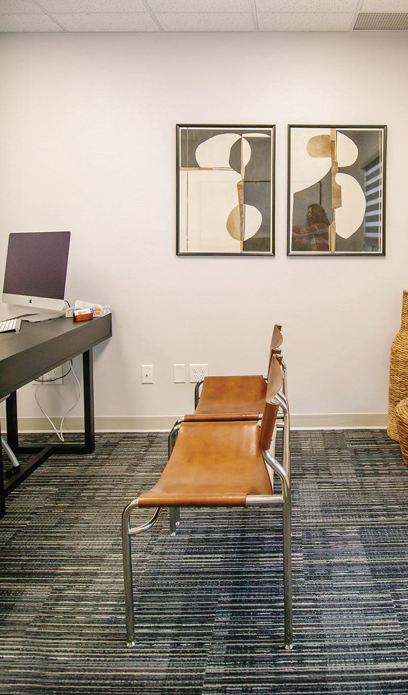 The renovation was completed in June of 2022 and Dr. Nuveen couldn’t be more satisfied with the results. His new space is stunningly modern, and features impressive art pieces and exquiste furniture from local creators. A beautiful fireplace is located at the center of the waiting room to provide additional warmth to patients who visit Dr. Nuveen in the cold and winter months. Complimentary water and coffee are available to patients as well as an inviting tiled toothbrush station. “We have chairs located in the treatment area for patients’ parents, but many parents have stopped coming back with them,” said Dr. Nuveen. “Now we see more people bringing in books and laptops; some even take naps,” he added with a chuckle. “It’s great to see that we’ve created a space where people can relax.”