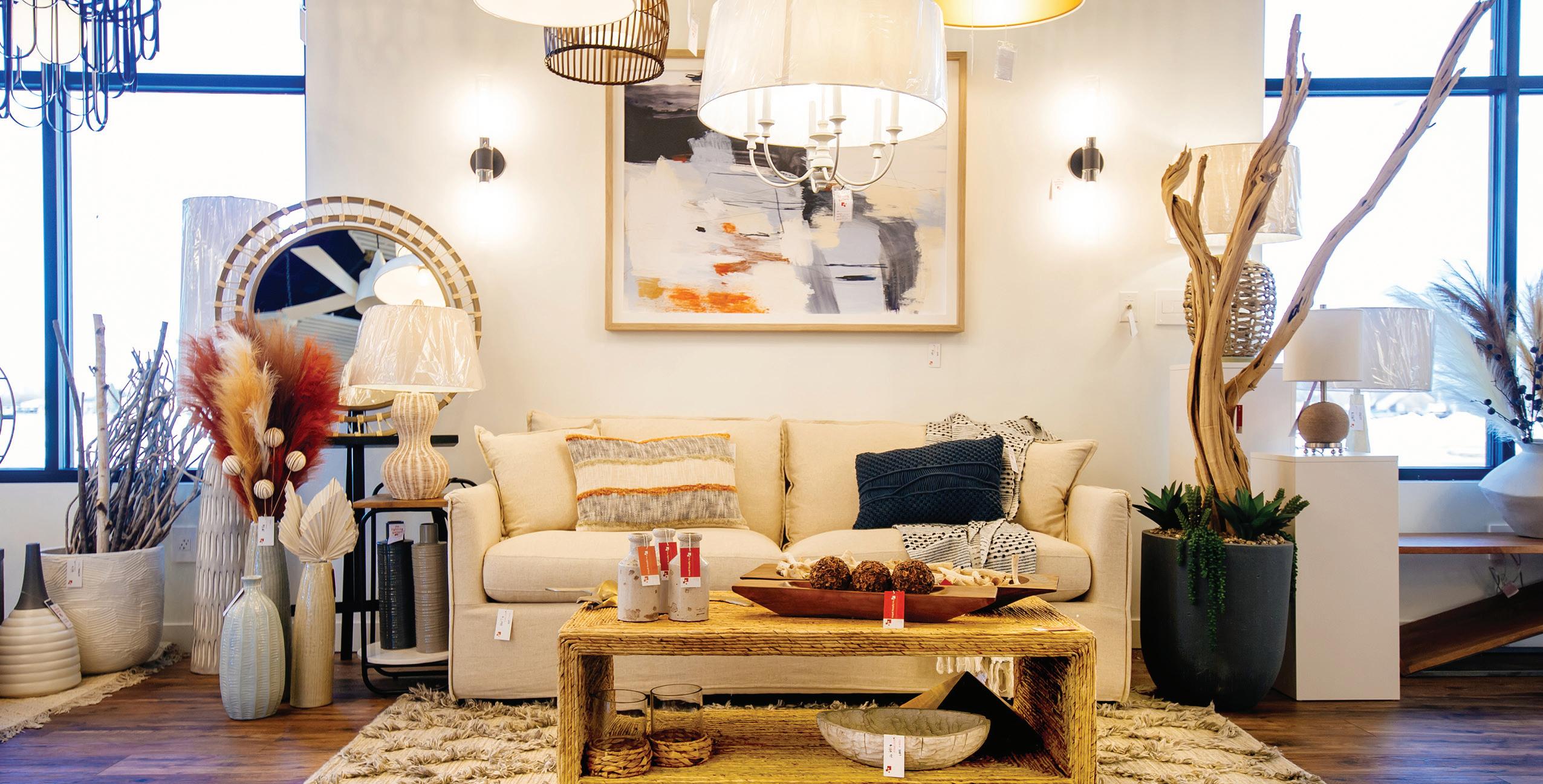 In addition to all the lighting fixtures you can imagine, the new space has provided the ability to offer more furniture and home décor items. Artwork hangs throughout the gallery, shelves of colorful throw pillows line one wall, and other accent pieces are thoughtfully displayed throughout the store. The gallery features a variety of nooks showcasing an inviting sectional sofa situated around a fireplace, modern dining tables and chairs, cozy bedroom furniture, a