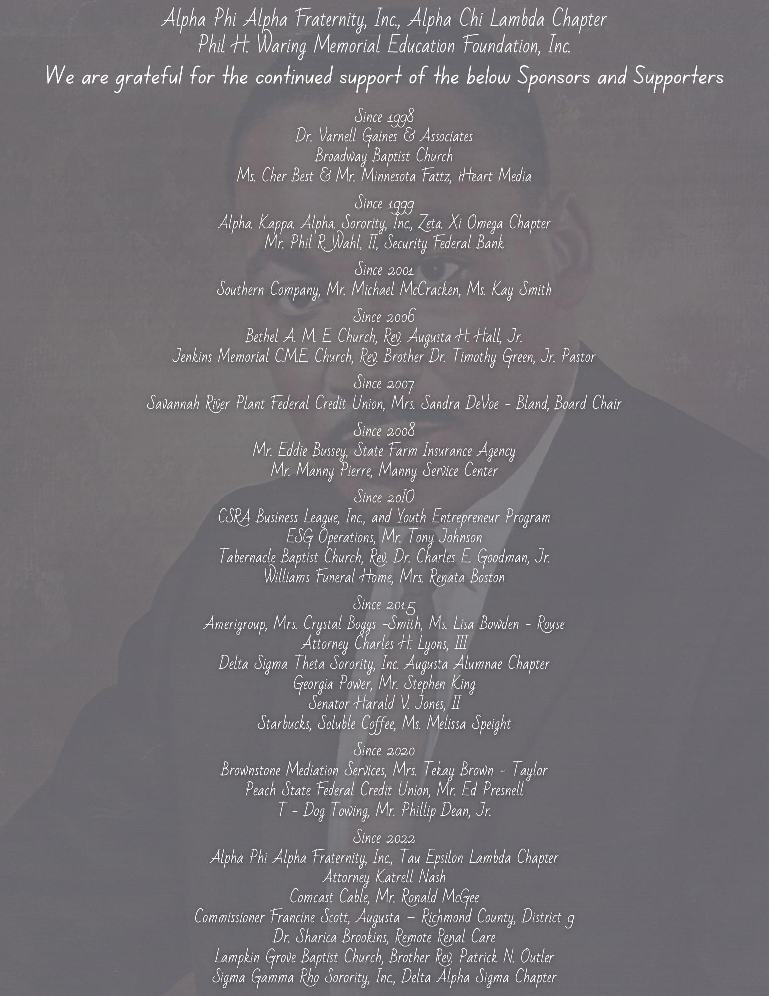 Over the years many corporations and individuals have supported our efforts, since 1998, such as Dr. Varnell Gaines, Broadway Baptist Church, Minnesota Fattz and Cher Best. Others who have continuously supported our efforts have been Alpha Kappa Alpha Sorority, Delta Sigma Thea Sorority, Zeta Phi Beta Sorority, Southern Nuclear at Plant Vogtle, Georgia Power, SRP Federal Credit Union, Eddie Bussey State Farm Insurance Agency, CSRA Business League, Starbucks, Manny’s Service Center, the late Tom Wiedmeier, Goodwyn, Mills and Cawood Engineering (GMC), the CSRA EOA, Tabernacle Baptist Church, Jenkins Memorial C.M.E. Church to name a few..