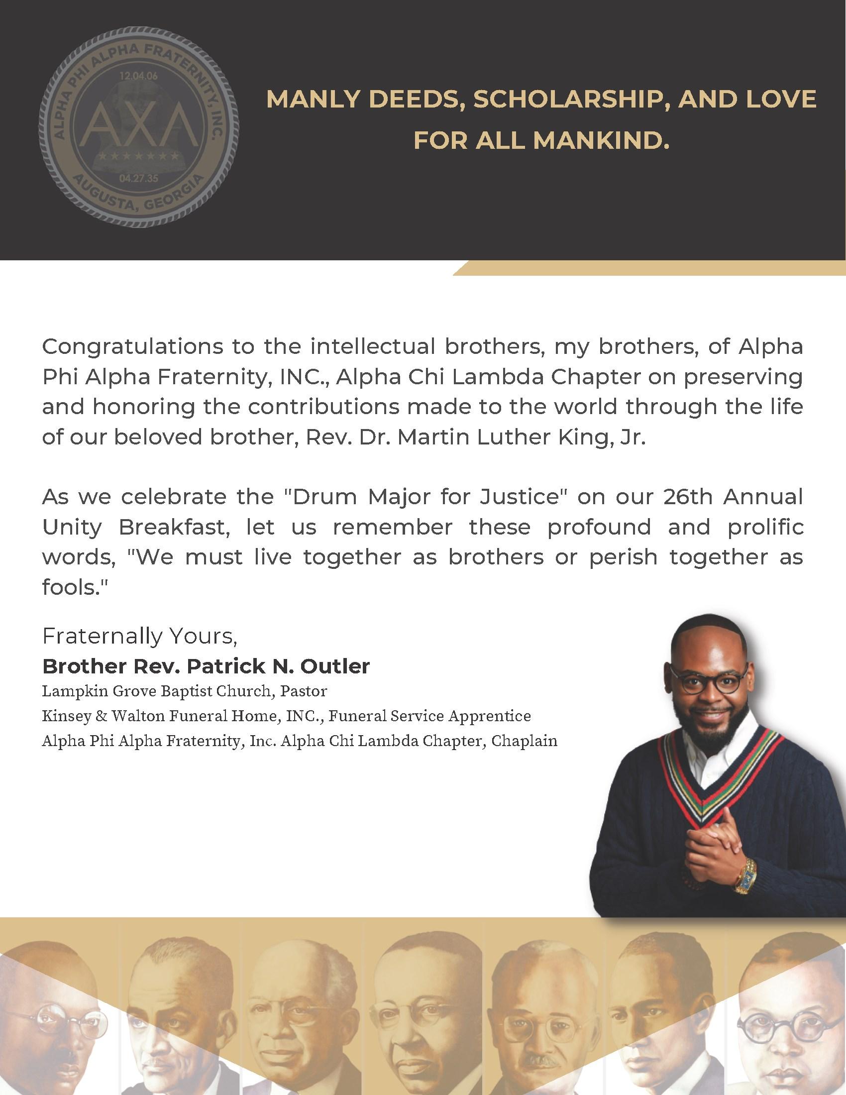 In 1997, Brother Bert T. Thomas motioned that the chapter commemorate the birthday of Brother Rev. Dr. Martin Luther King, Jr. by sponsoring a breakfast on the morning of the holiday. Chapter President Brother George L. Bailey named Brother Johnny J. Holmes the chair of the committee charged with planning the Rev. Dr. Martin Luther King, Jr. Unity Award Breakfast. The first Breakfast was held at the then Sheraton Augusta hotel with Brother Judge John H. Ruffin, Jr. as the keynote speaker, and the first Unity Award was given to Augustans Together in honor of Brother Phil H. Waring.