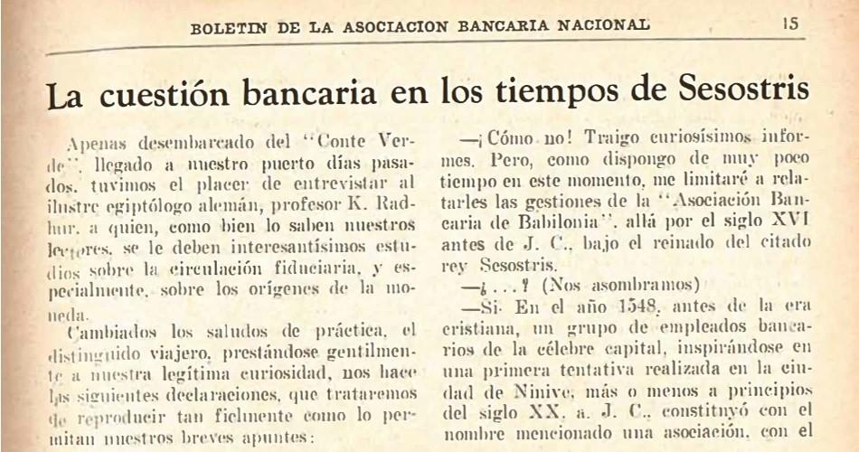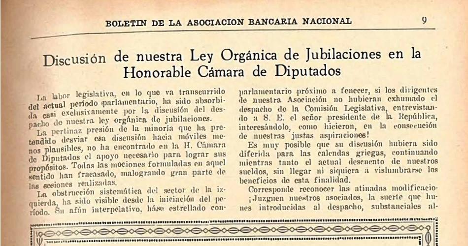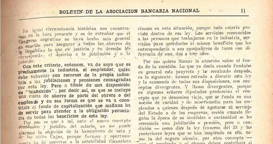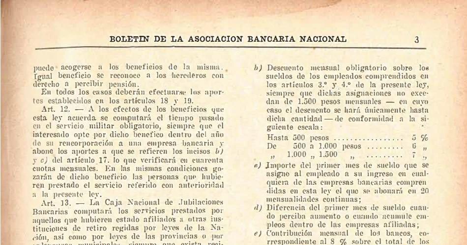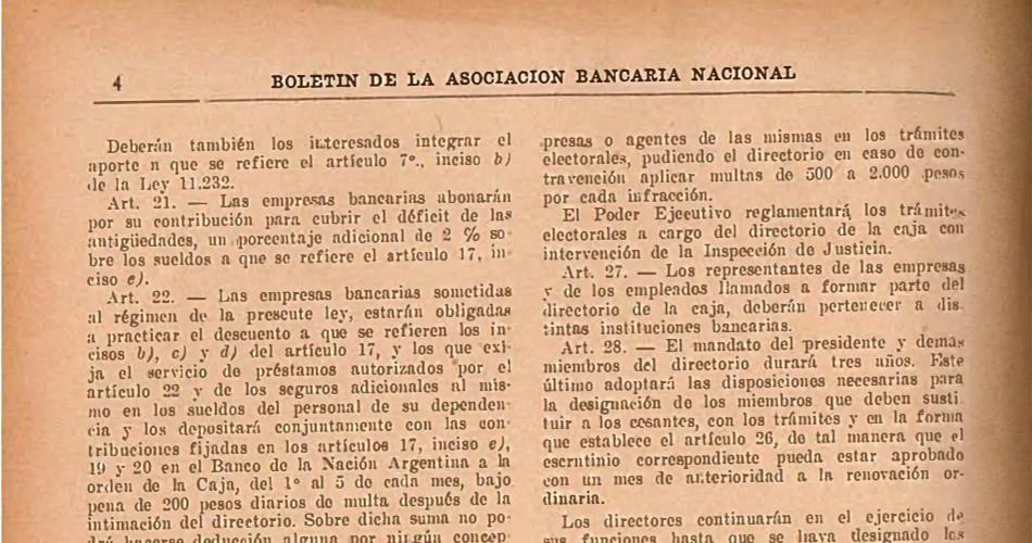 Boletín de la Asociación Bancaria Nacional : órgano informativo del personal bancario. Cambio de título: hasta 1934 como Boletín de la Asociación Bancaria, titulo posterior “Acción Bancaria” a partir de 1935, continuo con el mismo propósito inicial, ser una vía de comunicación entre la Asociación Bancaria y los empleados bancarios de todo el país. Existencias en la colección impresa: Existencias: 1928-1934. (Boletín). 1935-1948, (1949-1954), 1955-1957. (Acción Bancaria). Numero presente en la colección impresa de la Biblioteca Tornquist), solicitar por: BCRA-BT:REV. 216.2. (a. 1, n. 1, jul. 1928.) https://bcra.koha.theke.io/cgi-bin/koha/opac-detail.pl?biblionumber=59346