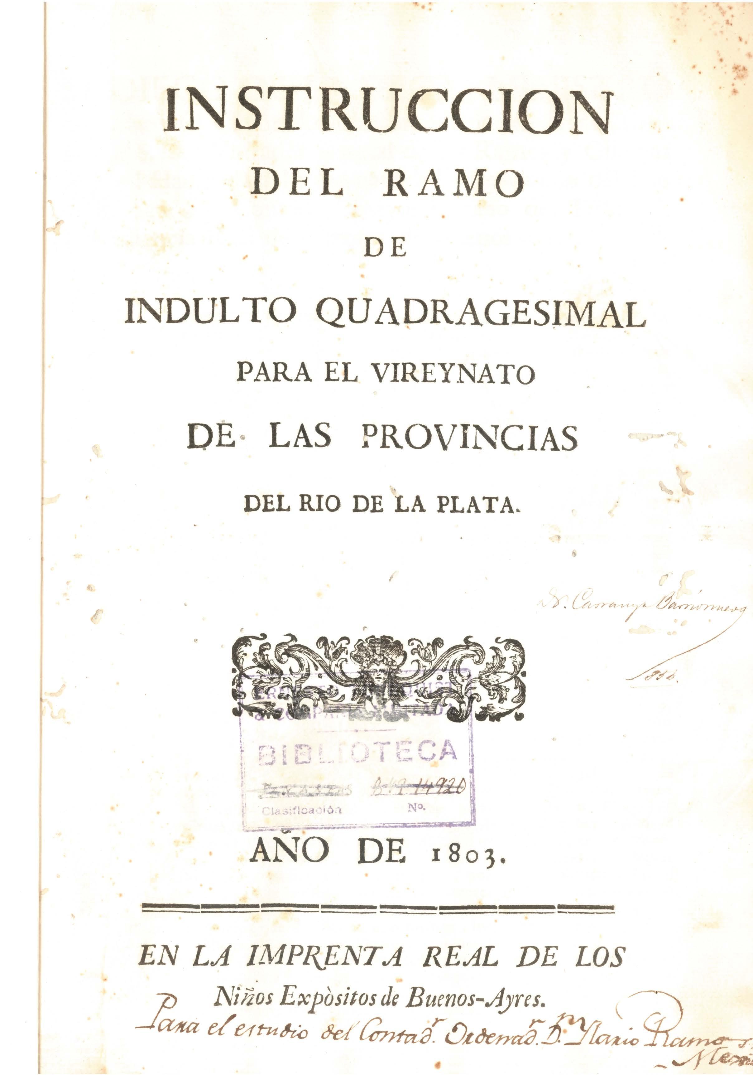 Instrucción del Ramo de indulto quadragesimal [sic] para el Vireynato [sic] de las Provincias del Río de la Plata. - Buenos Aires : Imprenta Real de los Niños Expósitos de Buenos-Ayres, 1803.