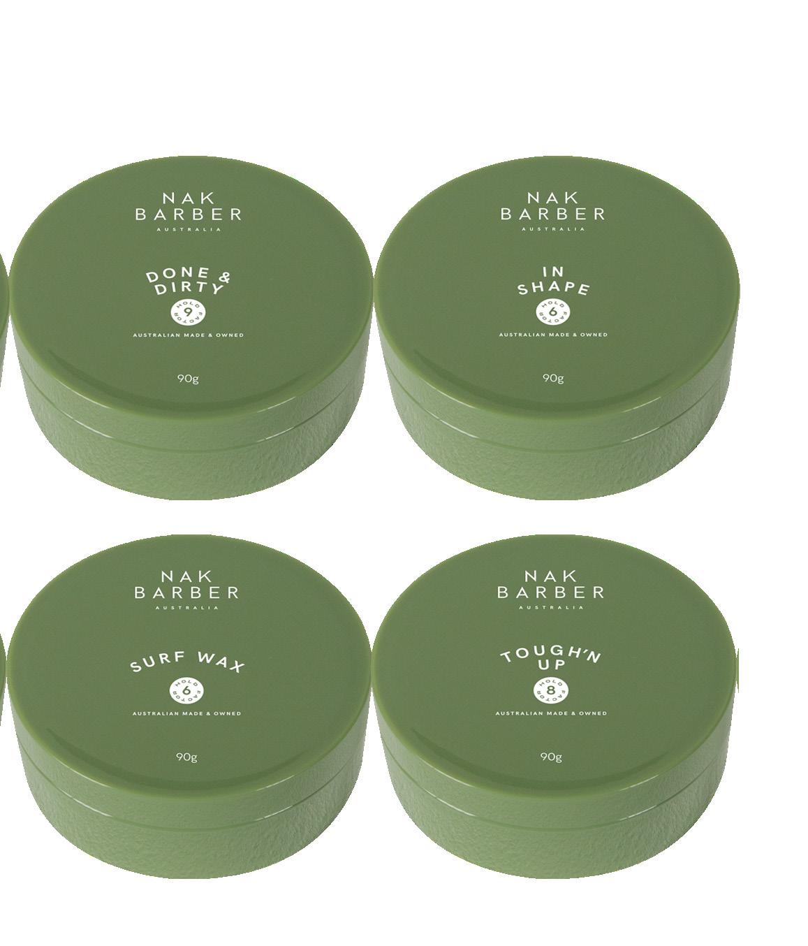 For styling hair, choose from Done & Dirty, a hard clay for extreme hold with no shine; Tough’N Up, a no shine putty with strong hold and matte finish; Out of Control, a clay/semi strong hold for matte moveable control; In Shape, a low shine shaping paste for firm hold; Surf Wax, a wax pomade that creates sea salt beach texture; and Slick Pomade, a wax pomade for high shine and slick back grooming.