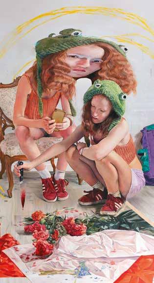 Znacie to uczucie, gdy zaglądacie pod mętną powierzchnię wody w rzece lub jeziorze? Wkładacie ręce, zanurzacie stopy, bo chcecie, żeby oplotły je te mokre, wciągające, oślizgłe materie? Edyta Hul w swoim wielkoformatowym malarstwie wychodzi od kształtów natury i zmierza ku abstrakcji. Łącząc farby olejne z emaliami przemysłowymi, osiąga dodatkowy efekt wizualnej głębi i gęstości. Indywidualna wystawa Coś jest w wodzie to nagroda za Grand Prix 46. Biennale Malarstwa Bielska Jesień 2023, które zdobyła ex aequo z Karoliną Jarzębak i Adamem Kozickim. W tekście towarzyszącym wystawie Edyta Hul pisze: „Moje ciało jest nielokalne. Woda otula mnie jak płaszcz. Znam to dno, przesuwam się po nim chropowatą skórą, wiotkimi płetwami. Zahaczam skrzydłem o bujne gałęzie, wpadające pod powierzchnię (…) Łuska miesza się z listowiem. Teraz jestem jeziorem, rozlewam się ponad kamieniami, jestem ciężkie i gęste, potykam się o was wszystkich”. Obrazy na wystawie dopełnia warstwa dźwiękowa – instalacja Biocenosis zaprojektowana i wykonana przez Agatę Polak oraz zapis wideo wernisażowego performansu Any Szopy.