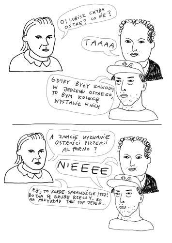 Maciek (Nagrobki): Gdyby były zawody w jedzeniu ostrego, to bym kolegę w nich wystawił. Kuba (Wczasy): A znacie Wyzwanie Ostrości pizzerii Al Forno?