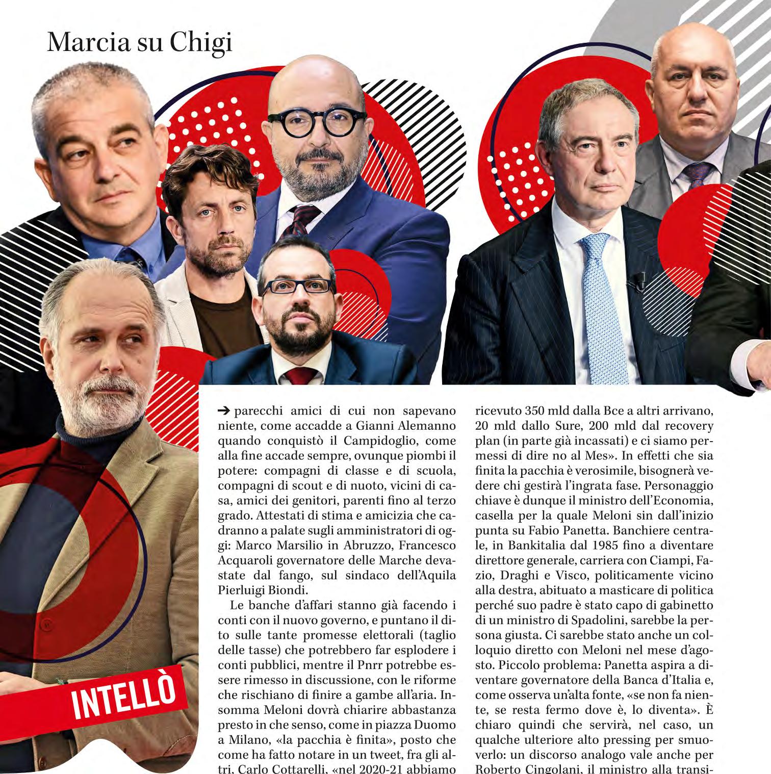 mine generosissimo per la scadenza dei vertici di Eni, Enel, Leonardo, Poste, Terna, Amco, Consip, Consap, Sogin, Enav, giusto a citare i maggiori: oltre cinquecento poltrone da assegnare tramite Tesoro e Cdp, qualcosa di talmente ampio da aver fatto pensare ai maligni, prima dell’estate, che Mario Draghi o chi per lui sarebbe stato disposto ad allungare artatamente di qualche mese il governo al solo fine di poterle decidere. Ma tant’è: per il futuro, giusto ad anticipare qualche nome, appare già ben posizionato l’ad Claudio Descalzi, per una riconferma all’Eni, l’ad di Terna Stefano Donnarumma, già visto a Milano alla Conferenza programmatica di FdI in primavera, mentre gira anche il nome di Paolo Gallo di Italgas e dell’ex ceo di Fincantieri Giuseppe Bono. Andrea Abodi, ad del Credito sportivo, il nome che Meloni aveva fatto per il Comune di Roma, potrebbe andare a Sport e Salute spa o, secondo altri, alla presidenza del Coni. E si potrebbe proseguire, stile Pagine gialle, per chi se le ricorda.